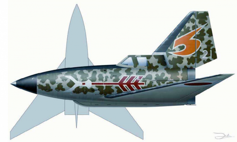 Несмотря на грубоватый вид самолёт мог развить максимальную скорость свыше 1000 км в час. Утверждается, что управление было столь простым, что на нём мог летать кто угодно после инструктажа (как-то с трудом верится…). В теории процесс выглядел следующим образом. Пилот садится в самолёт, взлетает по направляющим длиной 24 метра с помощью пороховых ускорителей. Потом летит на «автопилоте» под управлением с земли к месту боя. Там он выключает ручное управление, целится и выпускает в супостата 24 ракеты калибром 73 мм, или 33 ракеты калибра 55 мм. Был ещё вариант с пушками. А вот варианта с шасси не было. Если пилот промахивался, то он мог направить свою машину на чужую, а сам катапультироваться. Если он опять промахивался, то конструкция возвращалась на землю на парашюте. Хозяйственные ребята – даже с деревяшкой не расстанутся. Самолёт был деревянным и в разрезе выглядел вот так: