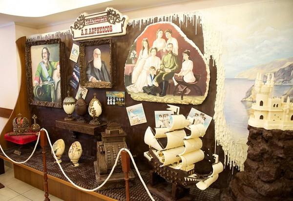 Вы можете увидеть исторические достопримечательности, картины и портреты – они представляют миру облик влиятельных, известных людей, что либо отличались особой любовью к сладкому деликатесу, либо сделали что-то весомое для его совершенствования, в том числе портрет изобретателя «киндер-сюрприза» русского барона Алексея Ивановича Абрикосова. В 1899 году фирме Абрикосовых было присвоено звание «Поставщик двора его императорского величества». Именно Абрикосов сделал шоколад модным продуктом в Крыму.