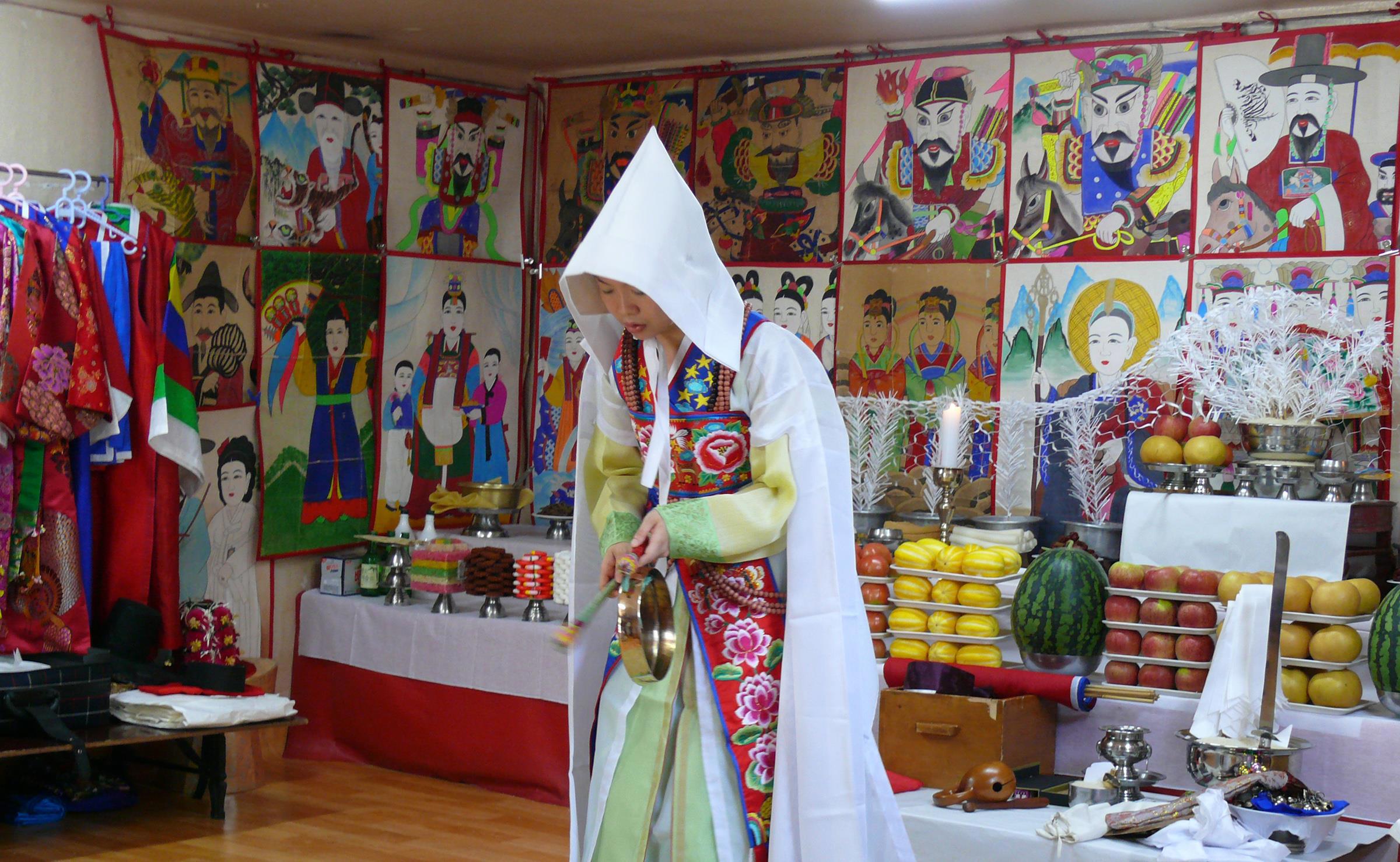Автор: Этьен ПуарНесмотря на патриархальность корейского традиционного общества, в организации культа традиционной корейской религии главную роль играли женщины. Так, например, подавляющее число священнослужителей были женщинами (их называли мудан). Но это ещё не всё! Если же шаманом становился мужчина (их называли паксу), то всё равно на время исполнения ритуалов он надевал женское платье. Вдобавок значительная часть главных героев корейских мифов — женщины. Словом, корейский шаманизм одна из немногих матриархальных религий.