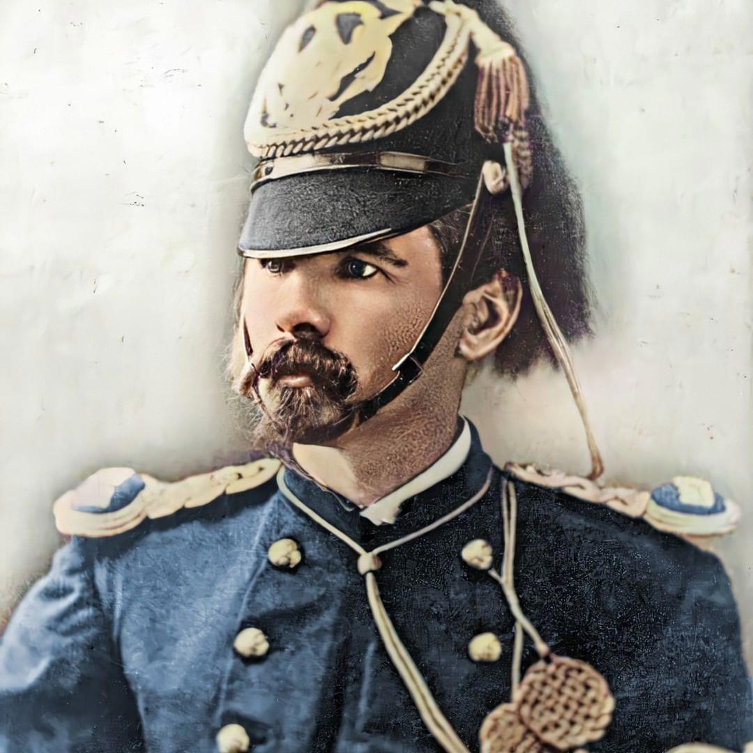 Родился в Ирландии. В двадцать лет добровольцем отправился воевать… за Папу Римского. Время было такое, Папа что-то там не поделил с королевством Сардиния и позвал добрых католиков со всей Европы повоевать за святую веру. Однако в Сардинии в тот момент армия была-ого, сплошные ветераны «войско Сардинское Севастополь брало, англо-французское помогало» и хотя папистов было вроде больше, война у них как-то не задалась. Кеог попал в плен, из которого его, впрочем, быстро выпустили, затем получил от Святого Престола несколько медалек и приглашение в Гвардию Ватикана. Но если для графа де ла Фер чина было мало, то для неугомонного ирландца – просто скучно. Кеог отправился в США, где как раз вовсю шла Гражданская война. Попал в кавалерию, участвовал в куче сражений и мелких стычек. Получил майора за Геттисберг. Традиционно уже попал в плен, но уже через 2,5 месяца был освобожден и повышен до подполковника. Поскольку никакой другой подходящей войны на горизонте не наблюдалось, решил остаться в американской кавалерии, где шла хоть какая-то движуха на западной границе, против индейцев. Правда, получалось не очень – как писал сам герой в письме: «Я никогда раньше не понимал, как трудно найти индейцев».