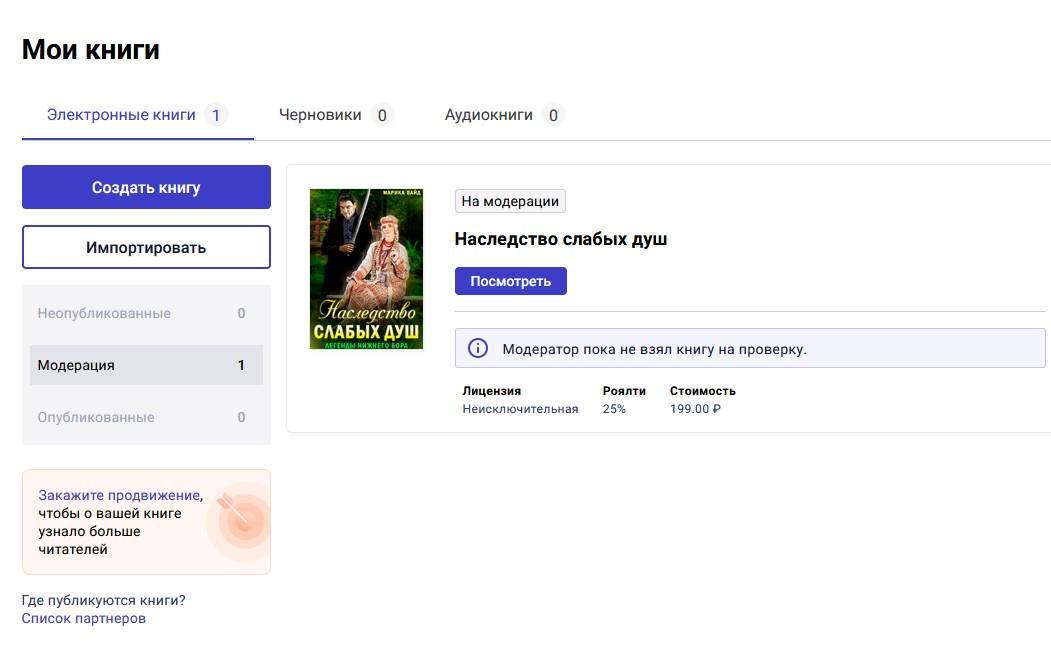 Пока модераторы возились с книгой, я потихоньку начала остывать к самому Литресу. Наконец, сообразила — автору выплатят лишь 25% от стоимости экземпляра. Цену они установили в 199 рублей. Следовательно, мне перепадёт аж… 47 с копейками. С барского плеча, так сказать. Второй неприятный момент: всё время бомбили мою почту рекламой с предложением заказать у них обложку за… 3 500 рублей. Ага, щас! Только шнурки поглажу. Меня и мой скромный коллаж устраивает. Тем более, он тоже был платный.