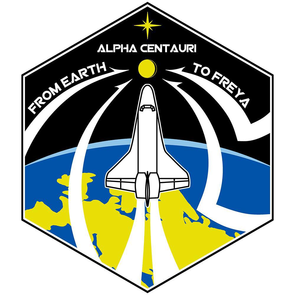 Космоплан тут изображён потому, что именно на них проводилась первая высадка на Фрейю - разведка и поиск подходящей для полноценной колонизации территории. Собственно, это по сути эмблема не самой миссии, а именно этой самой высадки. Просто космоплан круче смотрится в таком ракурсе, чем корабль-бублик.