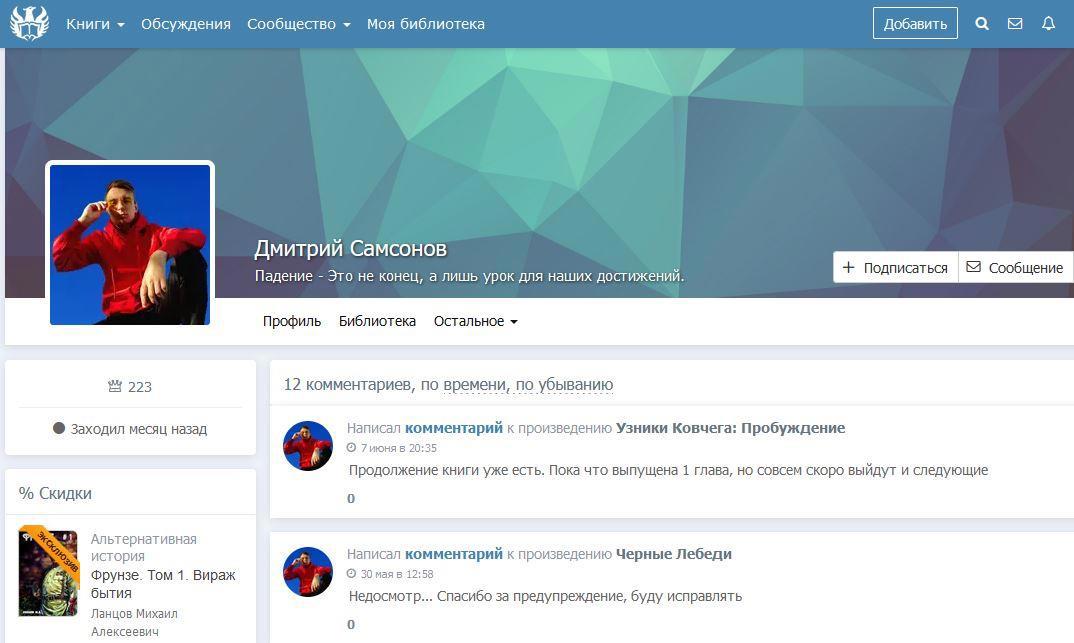 Этот чел сначала опубликовал мои книги "Пробуждение" и "Внедрение" из серии "Узники ковчега" под своим именем, а потом по каким-то причинам удалил их (возможно, кто-то пожаловался, ведь он, по всей видимости, публиковал произведения и других авторов тоже).