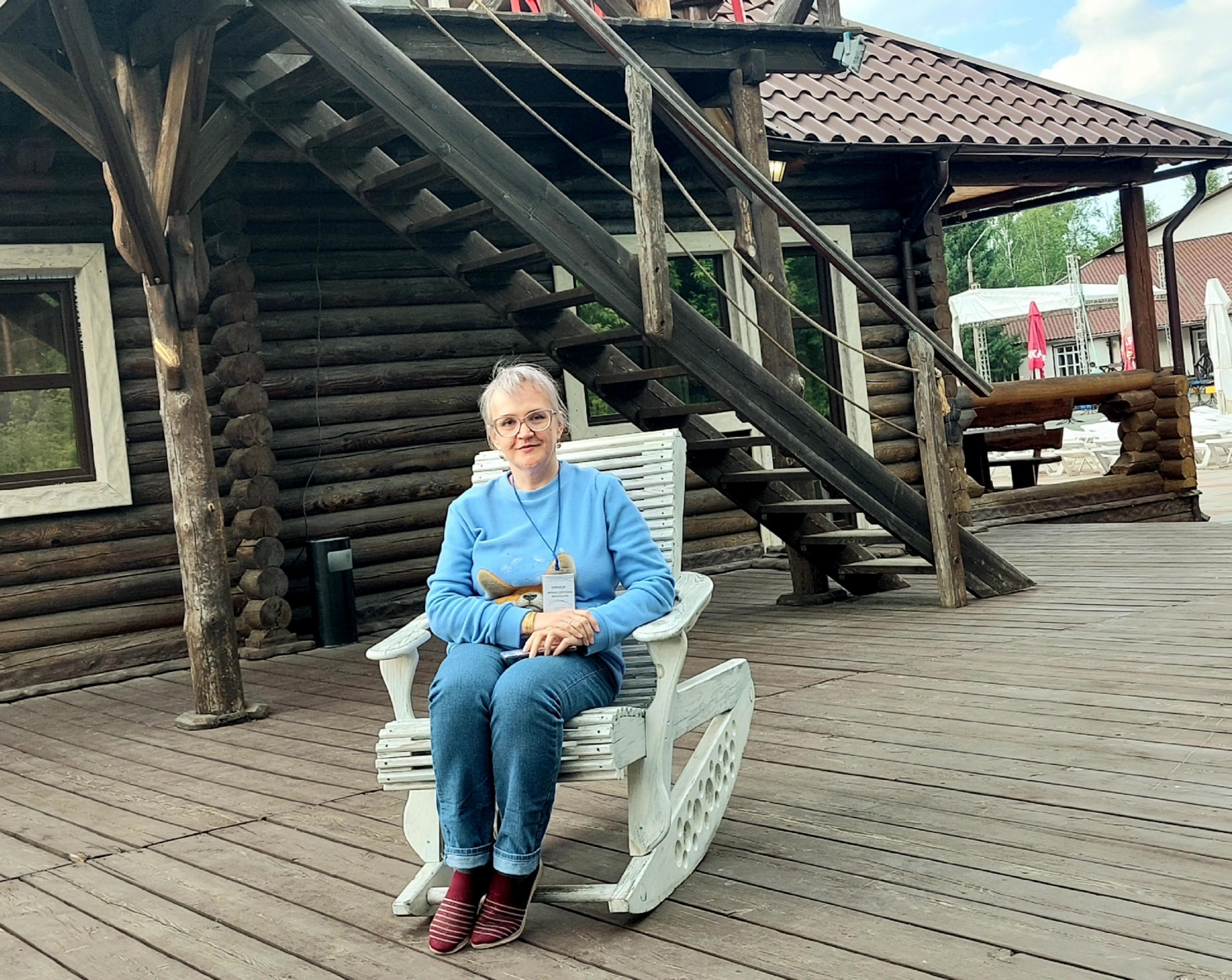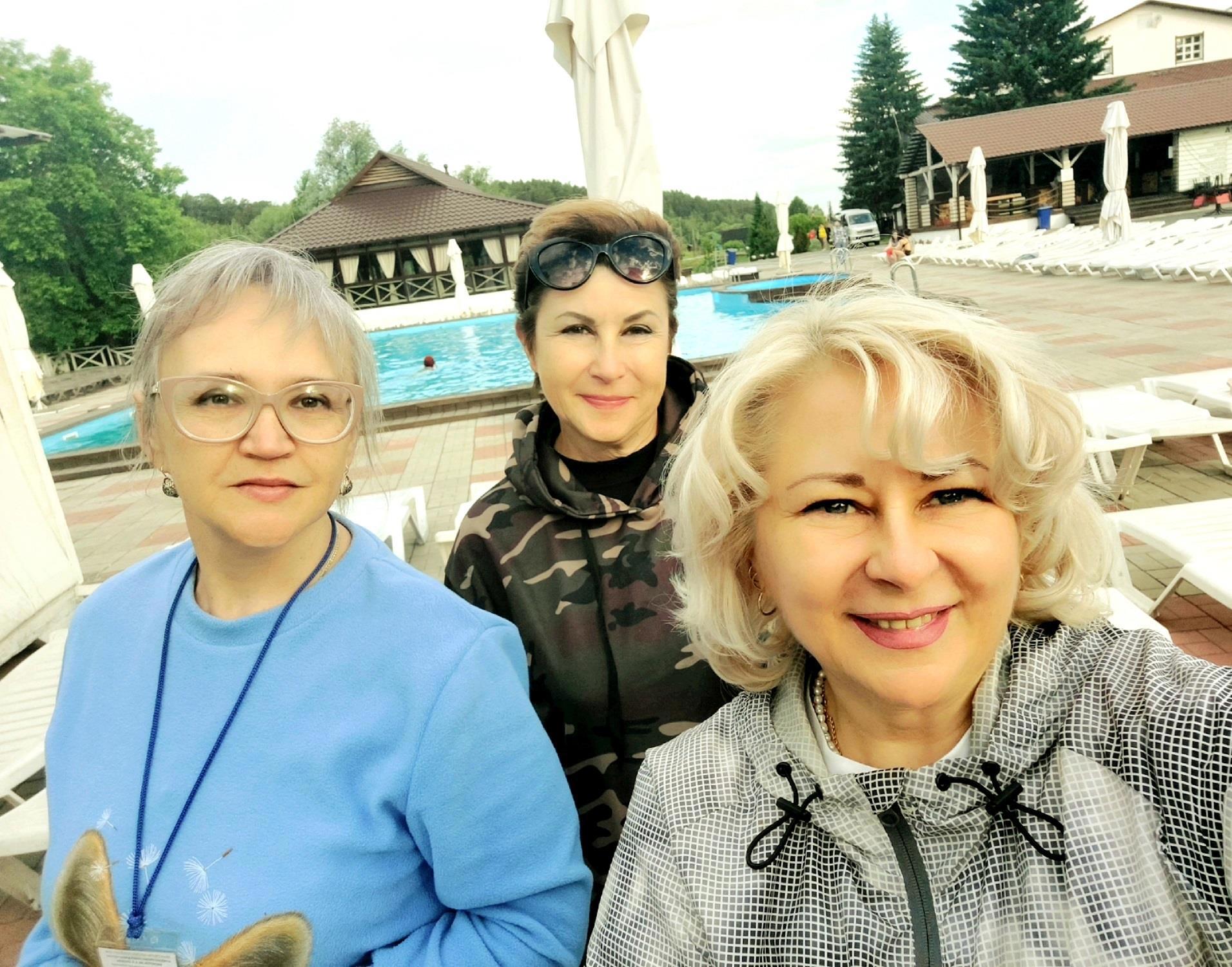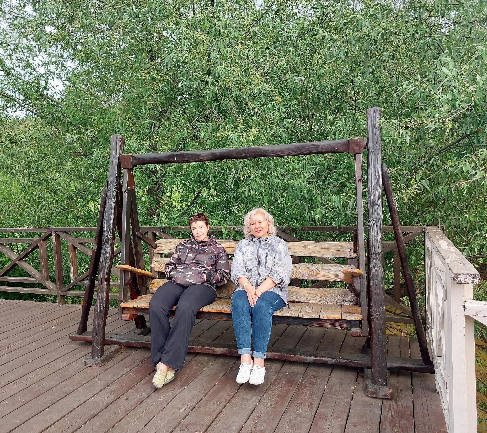 Фото сделаны в Барнауле, это парк-отель "Чайка", 22.06.2023 г. В тёмном - мой постоянный редактор Татьяна Берглизова, в голубом - наш редактор-полиглот Ирина Малышева (англ., испанск., немецк., румынск., цыганск. языки)