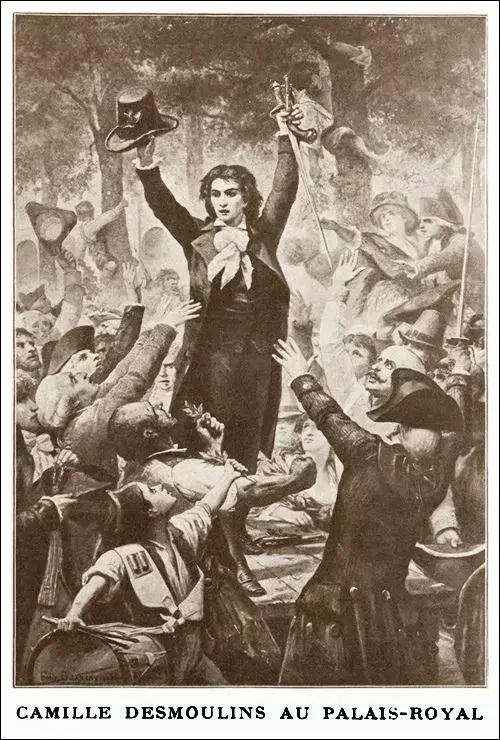 "Граждане! Время не терпит; отставка Неккера — все равно что набат Варфоломеевской ночи для патриотов! Сегодня вечером все швейцарские и немецкие войска выступят с Марсова поля, чтобы нас перерезать! Нам остается один путь к спасению — самим взяться за оружие! К оружию, граждане!"