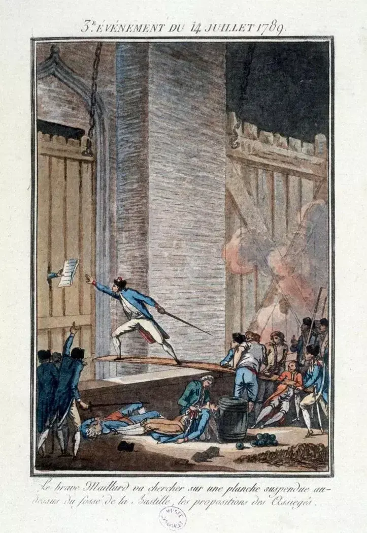 Повсюду стояли крики, слышалась стрельба из немногочисленных заряженных мушкетов. В это же время к зелёной кокарде добавляется красно-синяя, в цвет флага Парижа. Такие же флаги поднимаются над толпой.