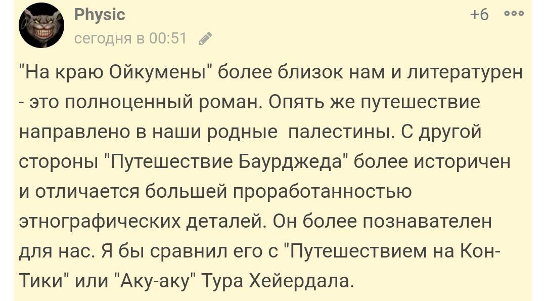 N.B. Впервые слово "Ойкумена" я услышал в далеком детстве, прочитав книгу Ивана Антоновича Ефремова "На краю Ойкумены". Книга произвела на меня большое ввпечатление. Я очень долго был под впечатлением этой книги. Значитьно позднее я прочитал и вторую часть серии "Великая дуга" - Это было "Путешествие Баурджеда". Вторая часть высвала у меня меньше эмоций, чем первая.