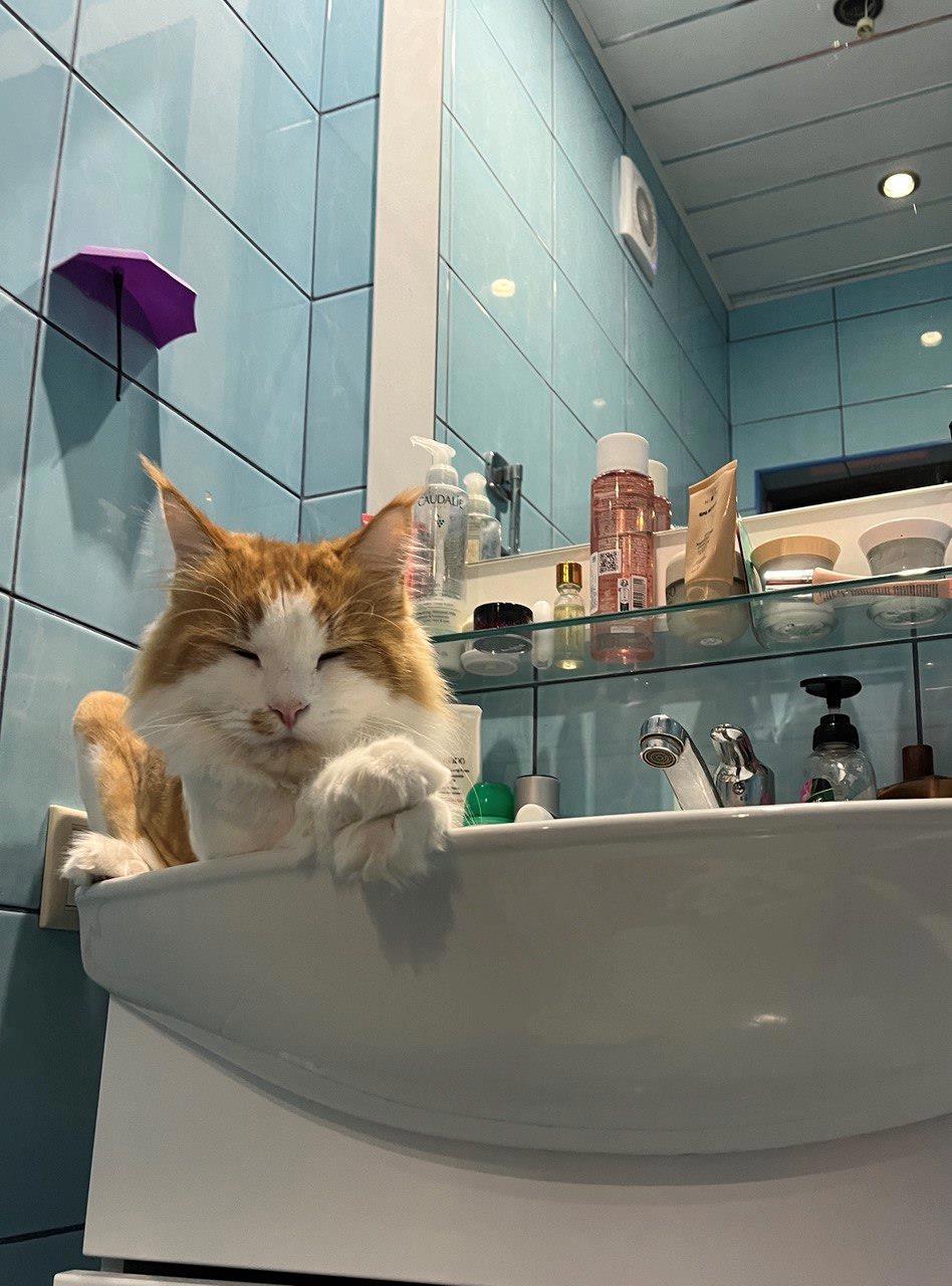 Каждый ванный день Кнопка усаживается на раковину и контролирует количество воды, которое я потратила.