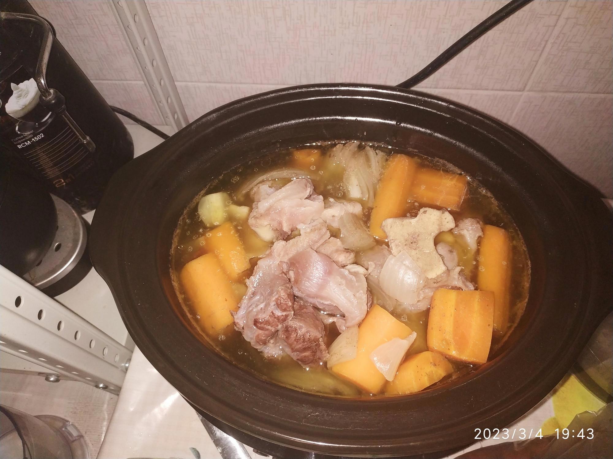 Готовится 8 часов. Есть два варианта - из костей с мясом и из мозговых костей. В первом случае мясо есть, во втором случае - мяса нет. Бульон архивкусный в обоих случаях. Я его даже не заправляю ничем специально - кидаю что под руку подвернется. Есть лучок - построгаю лучок. Есть морковочка - отлично, положу и морковочку. Лавровый листик? За пару часов до окончания, а если забыл - ну и ладно. Соль, перец - аналогично. Грибы сушеные? Можно и грибов положить. Фасоль? Сойдет и фасоль.