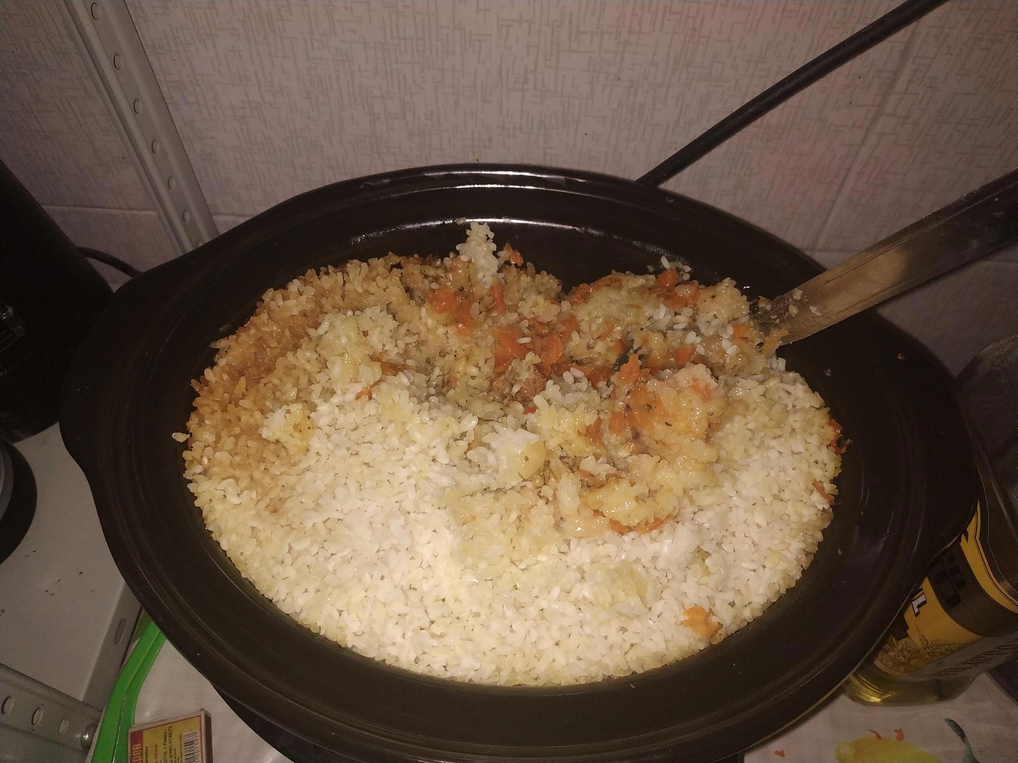 А вот плов (который не рисово-мясная каша), уже готовый. Да, это из килограмма мяса и двух стаканов риса получается еды на целую семью. Или толпу голодных чушменов. Напоминаю, чаша 3.5 литра объёмом: