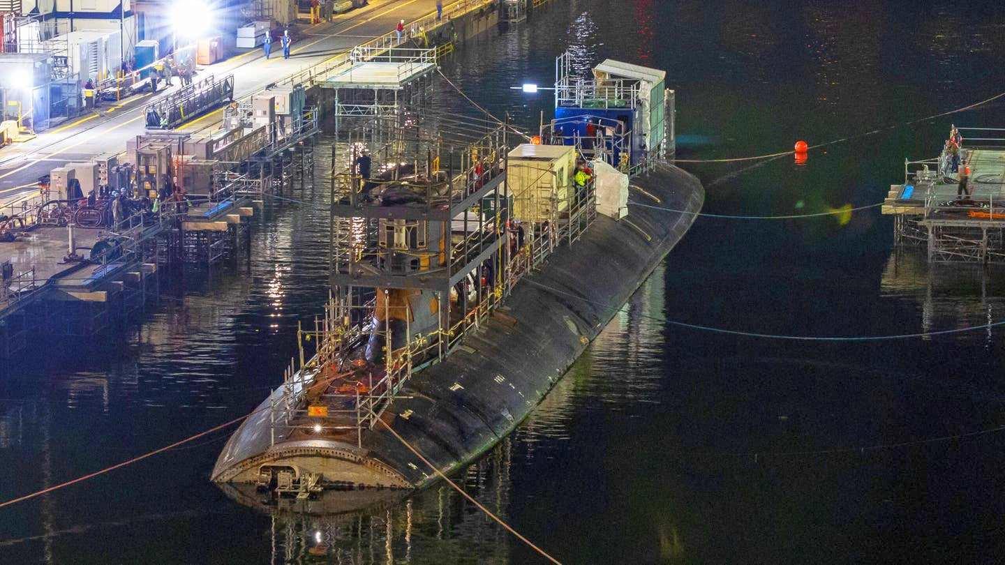 То есть я вроде как верю, что в случае с лодками типа «Seawolf» фактор «слишком дорого» исключать нельзя. Хотя то, что в 2021 году одна такая лодка с разгона впендюрилась в подводную скалу, говорит о том, что её «передовитость» не такая уж и передовая вообще-то. Раз они сумели скалу прямо перед носом прошляпить. И вот это и есть «во-вторых». Лодка на фотографии – та самая. Заметили, что носовой части у неё нет? То есть прошло два года с момента аварии, но к ремонту они только приступают… хотя, как сказать «приступают». Пытаются.