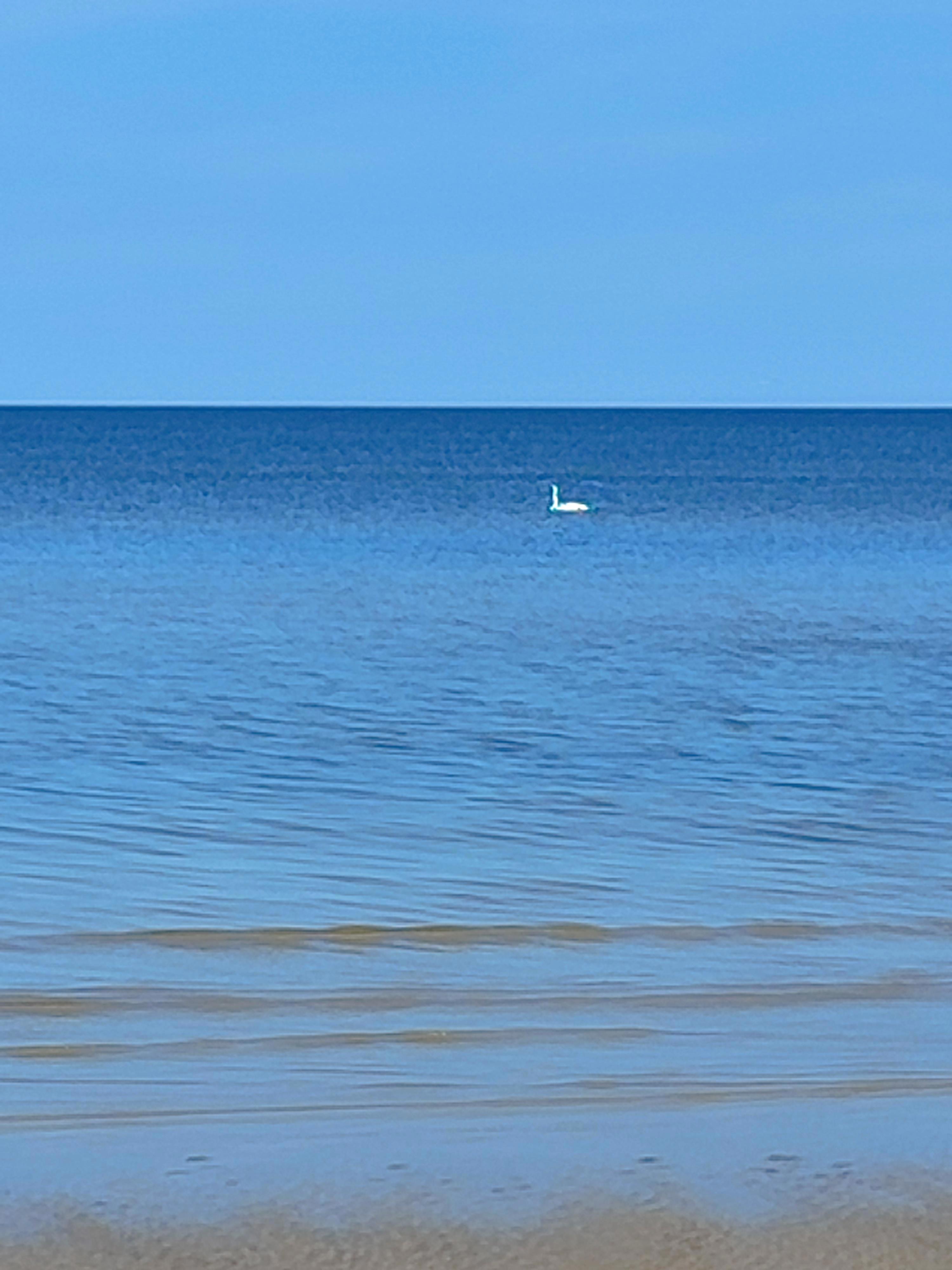 Первым, кого я увидела, если, конечно, не считать дядечку, с которым мы столкнулись на дорожке дюны, был лебедь. Самый, что ни на есть natürlich белый лебедь, плавно бороздивший горизонт Рижского взморья.