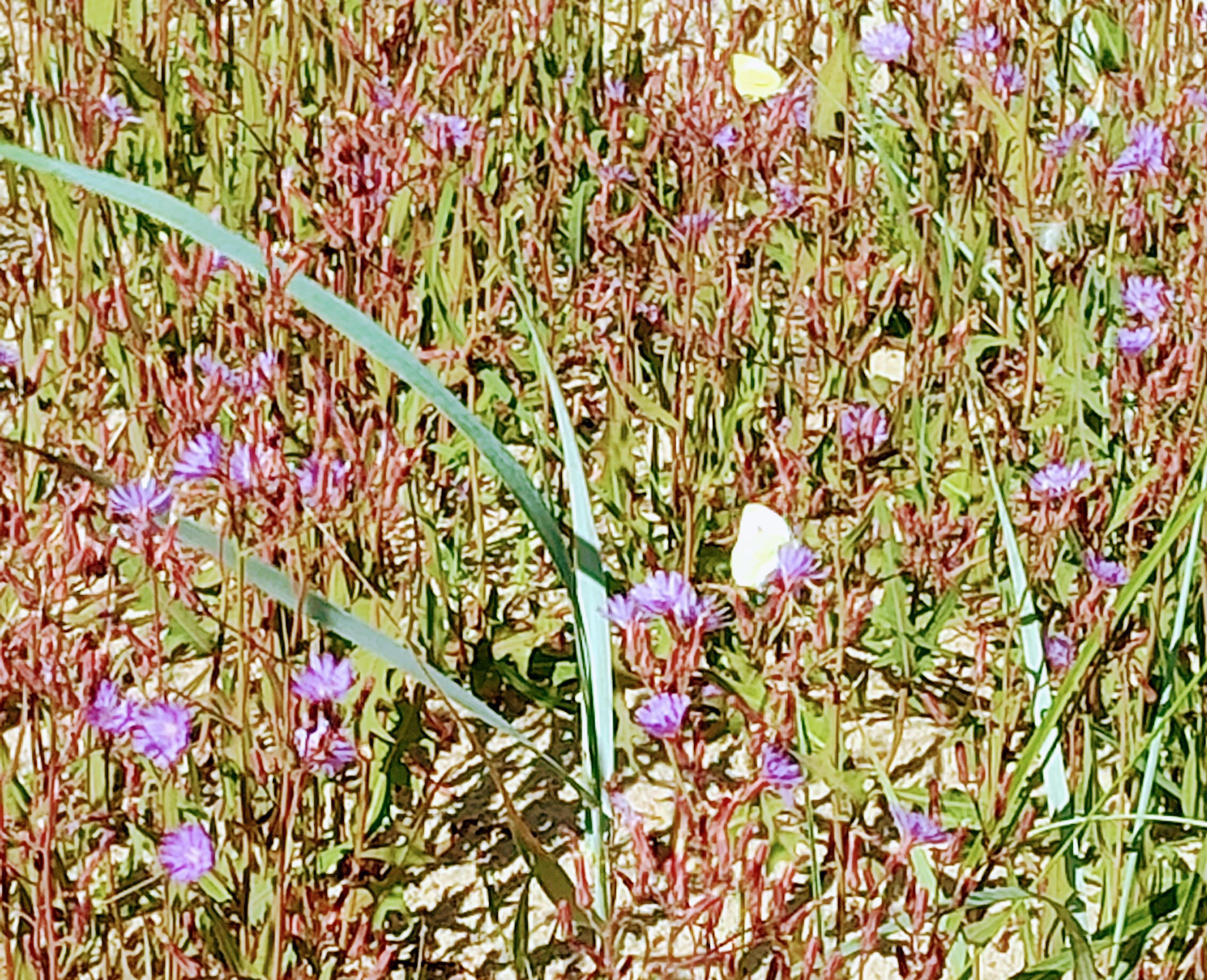 Потом меня доконала жара и я свернула в спасительную тень леска. По дороге попытавшись поймать в кадр целую стаю белых мотыльков, снующих над фиолетовыми цветами, сплошь покрывшими дюну.