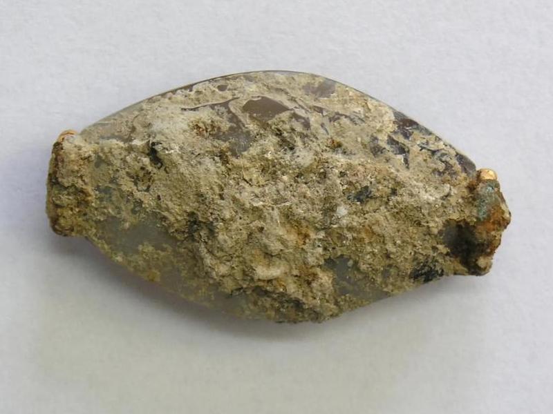 Третья фотография - так агат выглядел после извлечения из гробницы. Его сначала отложили в сторону, не придав большого значения. В гробнице "воина-грифона" и без него было много интересного, а тут нечто невзрачное. Как показалось поначалу.