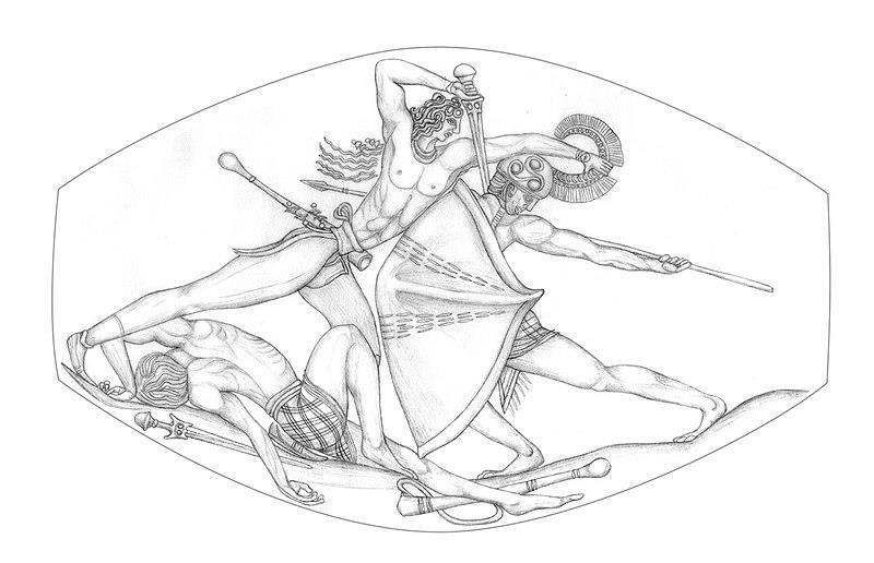 Автор: Евгений ТоктаевМикенская печать из агата, изображающая бой двух воинов (третьего уже уронили).