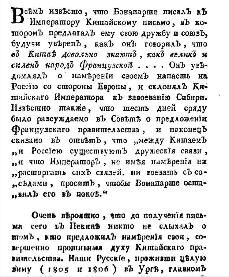 «Всем известно, что Бонапарт писал к Императору Китайскому письмо, в котором предлагал ему свою дружбу и союз, будучи уверен, как он говорил, что в Китае довольно знают, как велик и силен народ Французской... Он уведомлял о намерении своем напасть на Россию со стороны Европы, и склонял Китайскаго Императора к завоеванию Сибири.