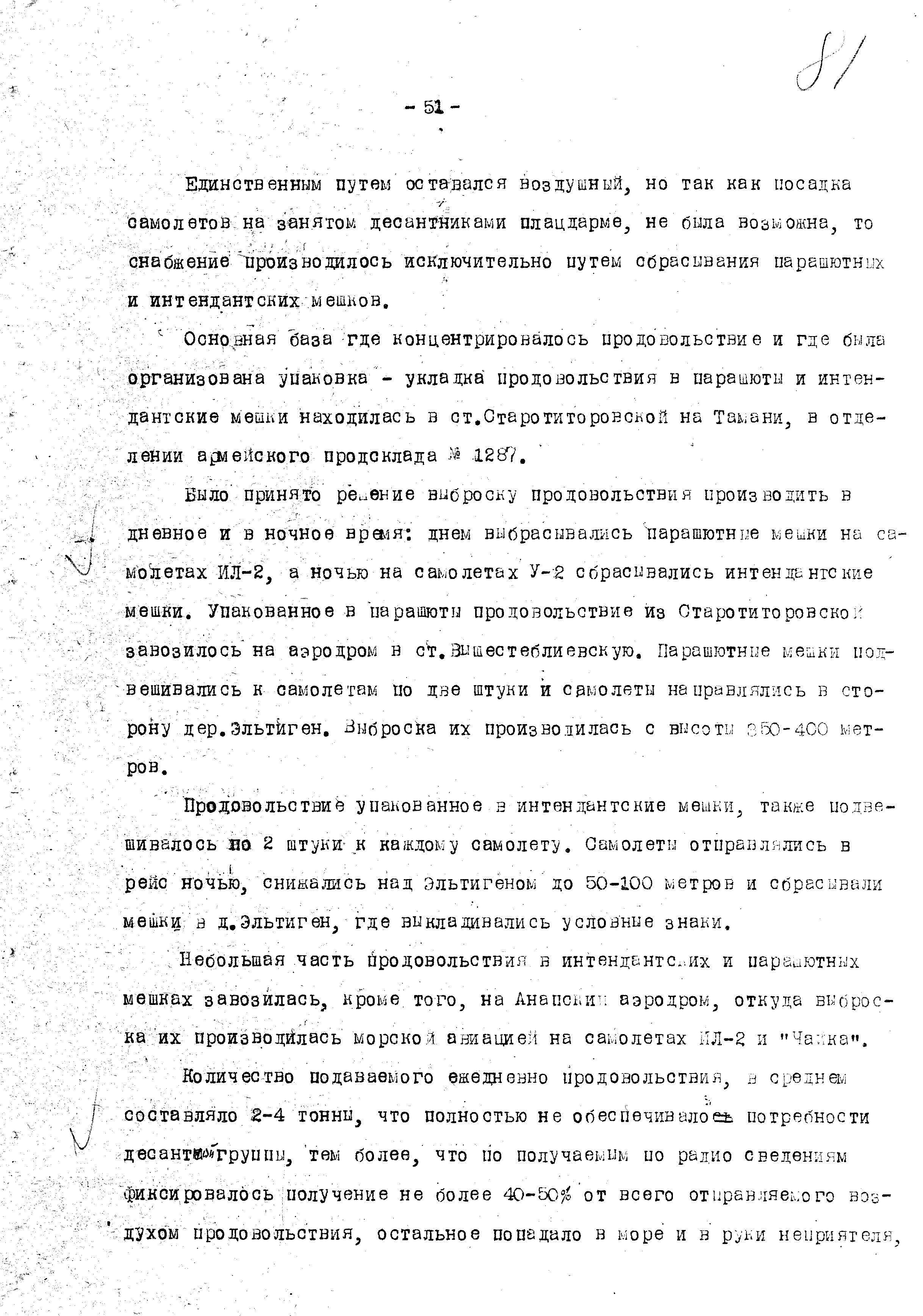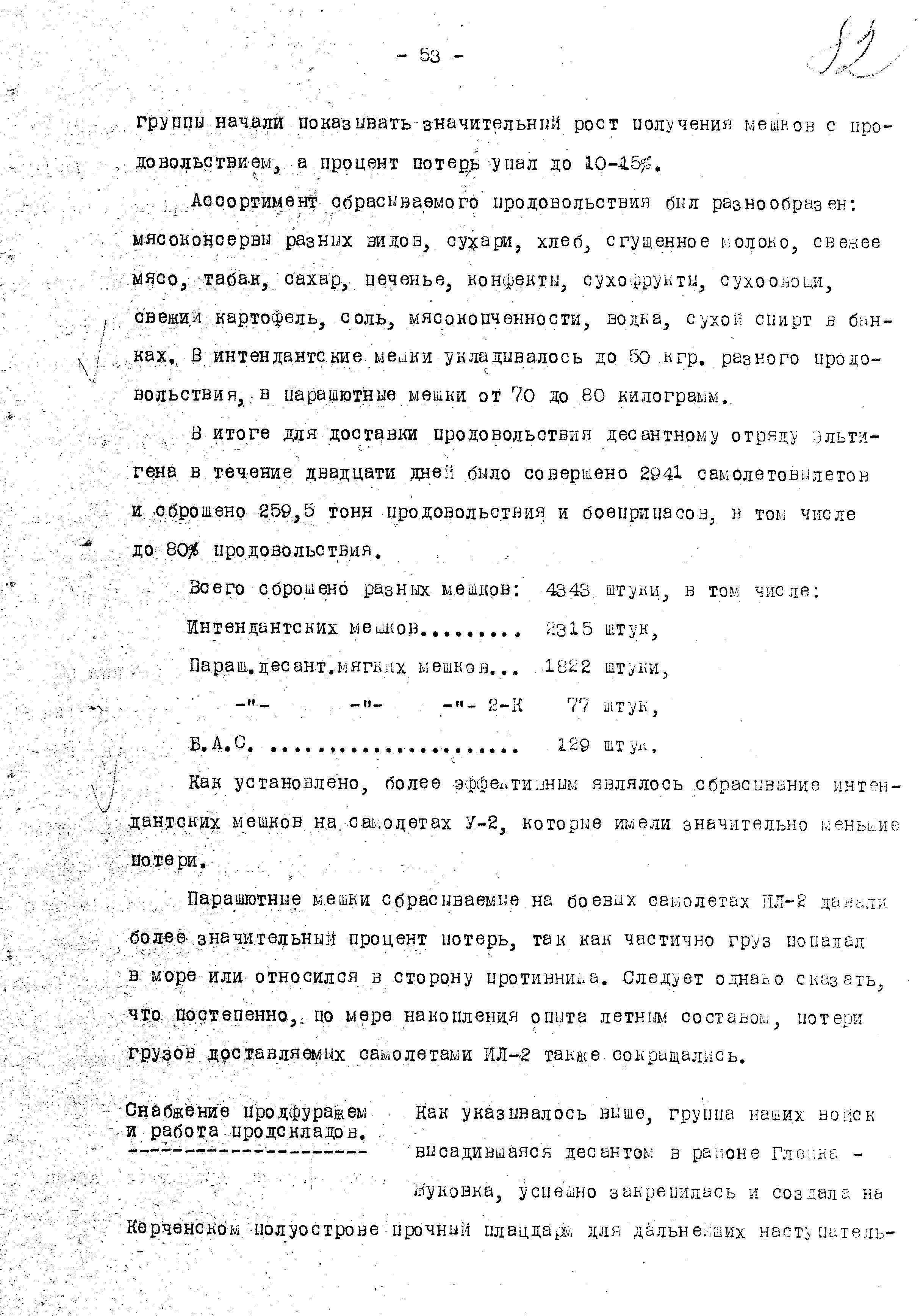 В статье Сброс продовольствия с самолёта беспарашютным способом. Август 1942 г. рассказывалось о испытаниях, проведённых командованием ВДВ Красной Армии совместно с представителями Главного Интендантского Управления. Как Вы должно быть помните, итогом стал краткий совместный Циркуляр объявлявший «Инструкцию по затариванию продовольствия и фуража для беспарашютного сбрасывания с самолётов». Так как, в последующем применение подобного способа в документах не попадалось, решил, что он был не очень распространён и применялся крайне редко. Однако же, Керченский десант одно время обеспечивался продовольствием в основном именно этим способом.