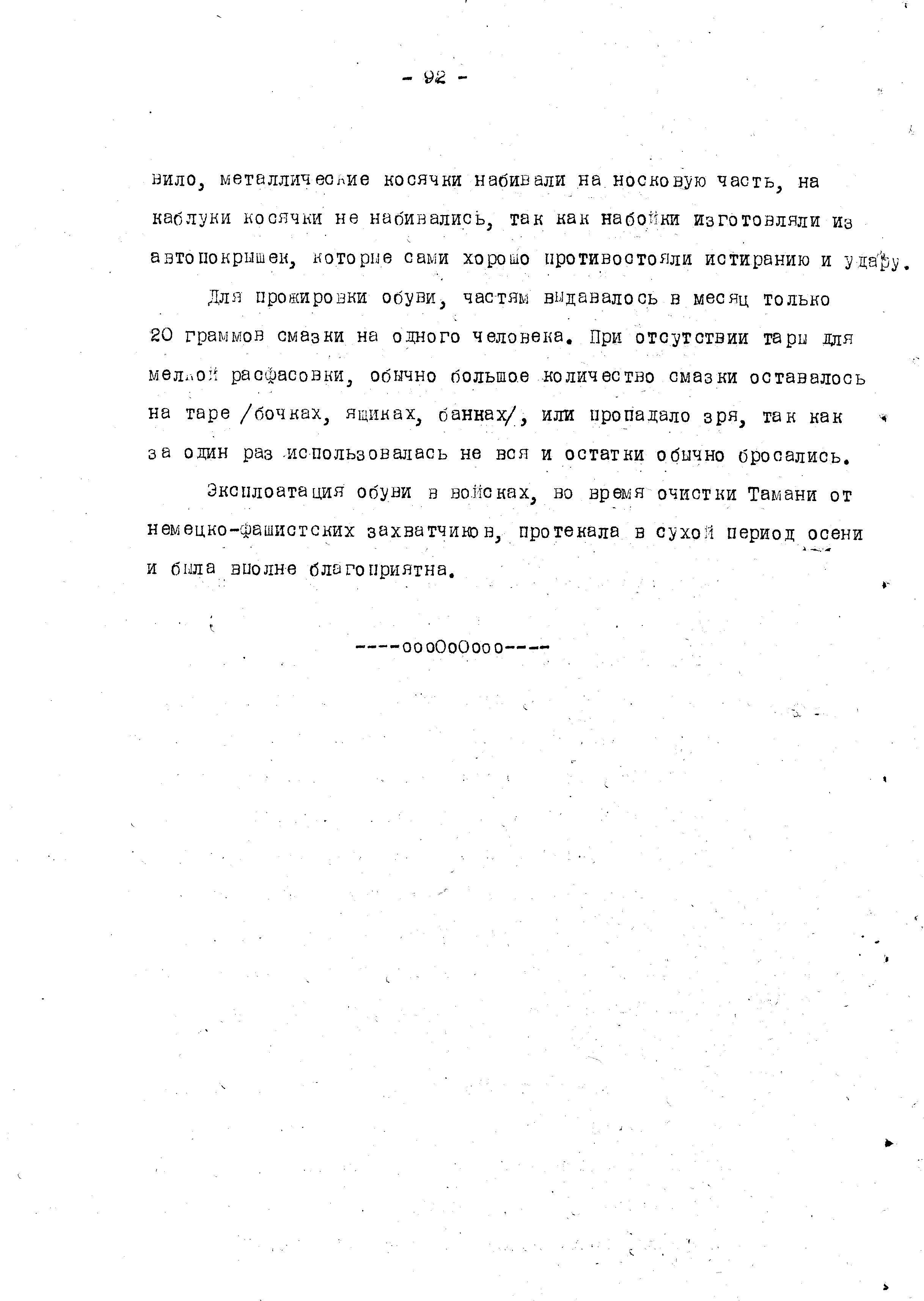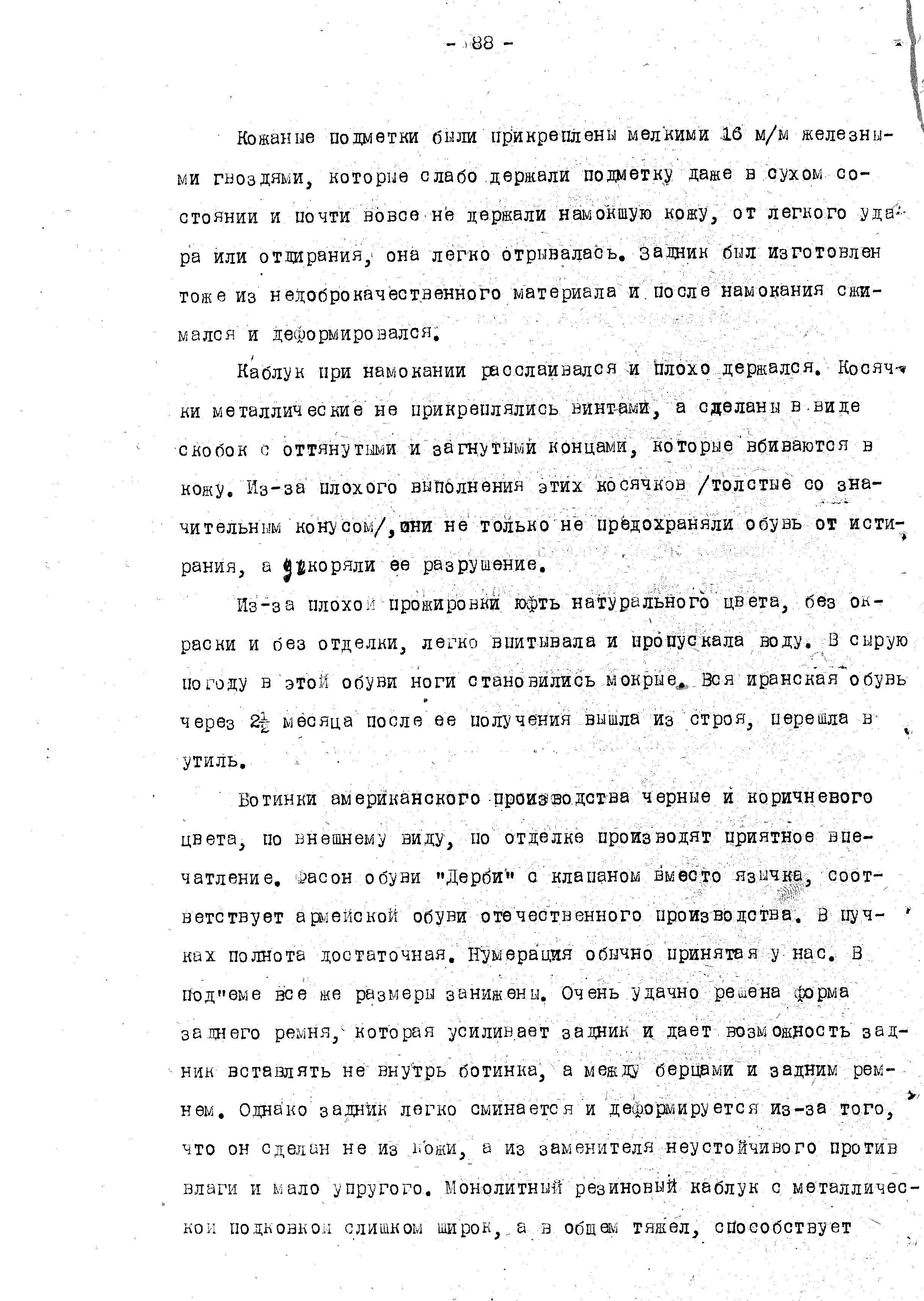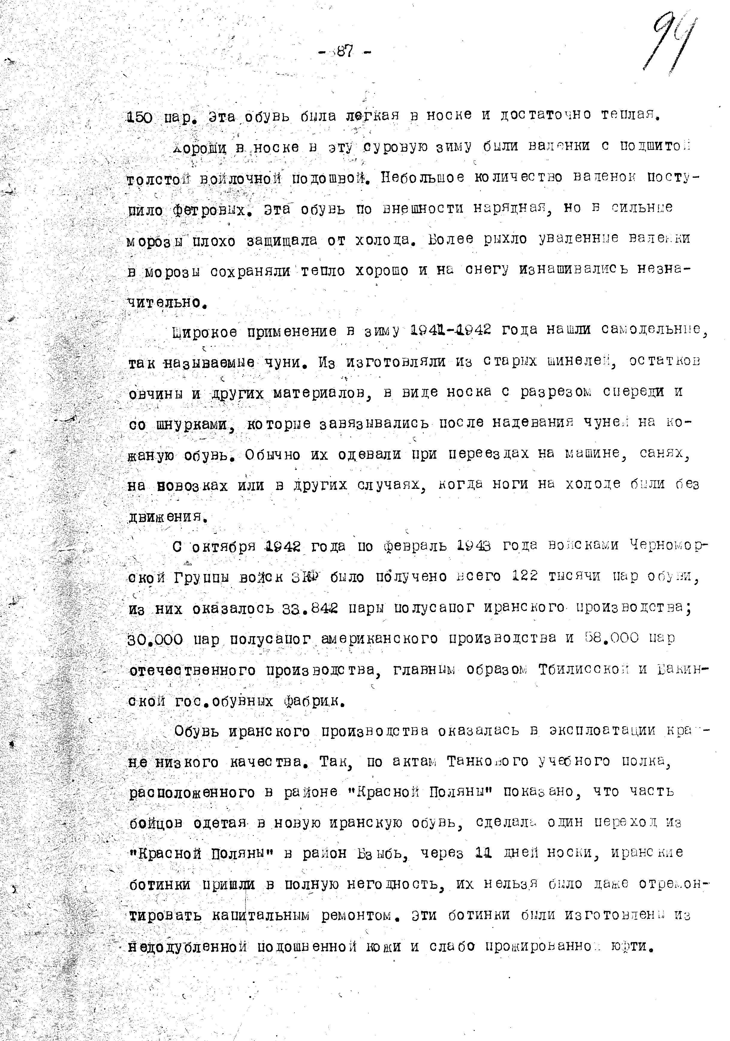 Следующий заинтересовавший момент — описание обуви, которая выдавалась бойцам и командирам Особой Приморской Армии. Так уж получилось, что помимо отечественной продукции, армия получала на снабжение ботинки, изготовленные в трёх странах: Иране, США и Англии. И это вполне объяснимо, так как в непосредственной близости от мест дислокации воинских частей ОПрА пролегал маршрут поставок импорта. Так вот, авторы доклада дают объективную оценку всем образцам обуви, как отечественным, так и иностранным, подробно рассказывают как о «плюсах», так и о «минусах» каждого образца. Не знаю, кому как, мне это показалось любопытным.