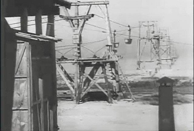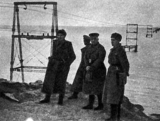 А теперь вернёмся к объекту, изображённому на схеме - мосту через пролив, а точнее к канатной дороге. Несколько лет назад, про неё неоднократно рассказывали в Интернете и СМИ, почему-то акцентируя внимание на том, что вместо планируемого автомобильного моста гитлеровцы построили грузовую канатную дорогу всего за 23 дня. Конструкция состояла из 25 опор на свайном основании, высота надводной части 2,5 м; на них монтировались металлические конструкции.