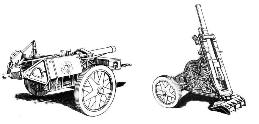105-мм (официально обозначался как 10-см) миномёт NbW41 в походном (слева) и боевом (справа) положении