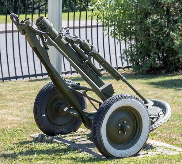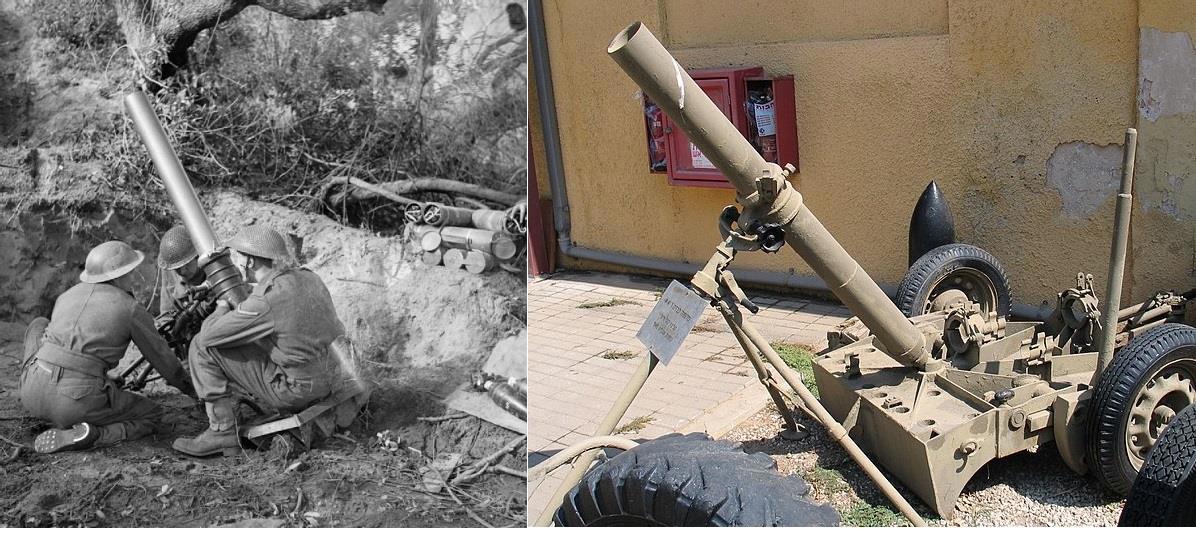 Британский 106,7-мм миномёт ML (слева) и его модификация, у которой опорная плита объединена с транспортной тележкой