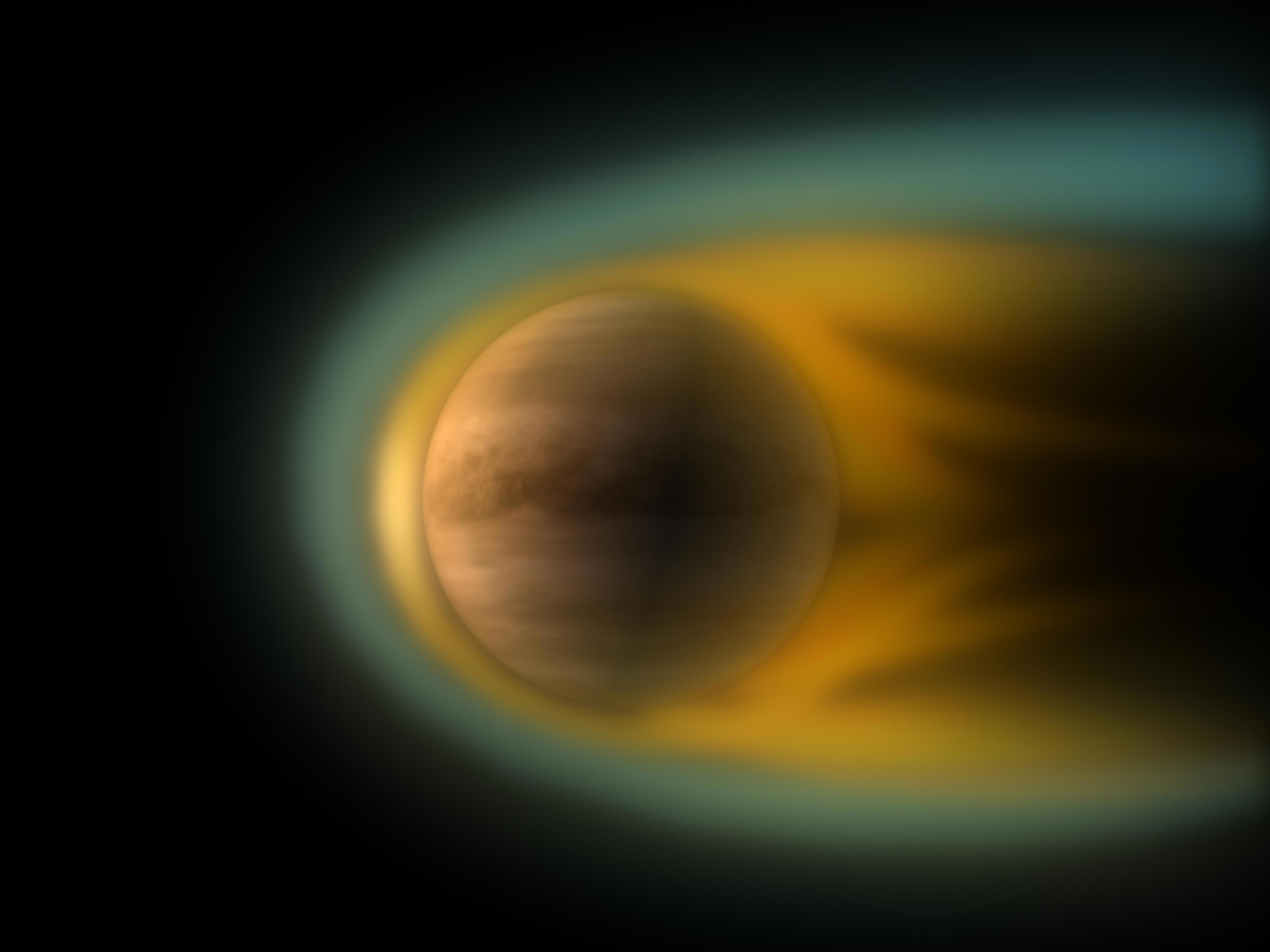 По всем законам физики, атмосферу с Венеры должно было сдуть ещё давным давно и она должна была больше походить на Марс или Меркурий, чем на газового гиганта. Даже на этом изображении видно, как в высоких широтах солнечный ветер цепляет атмосферу Венеры: