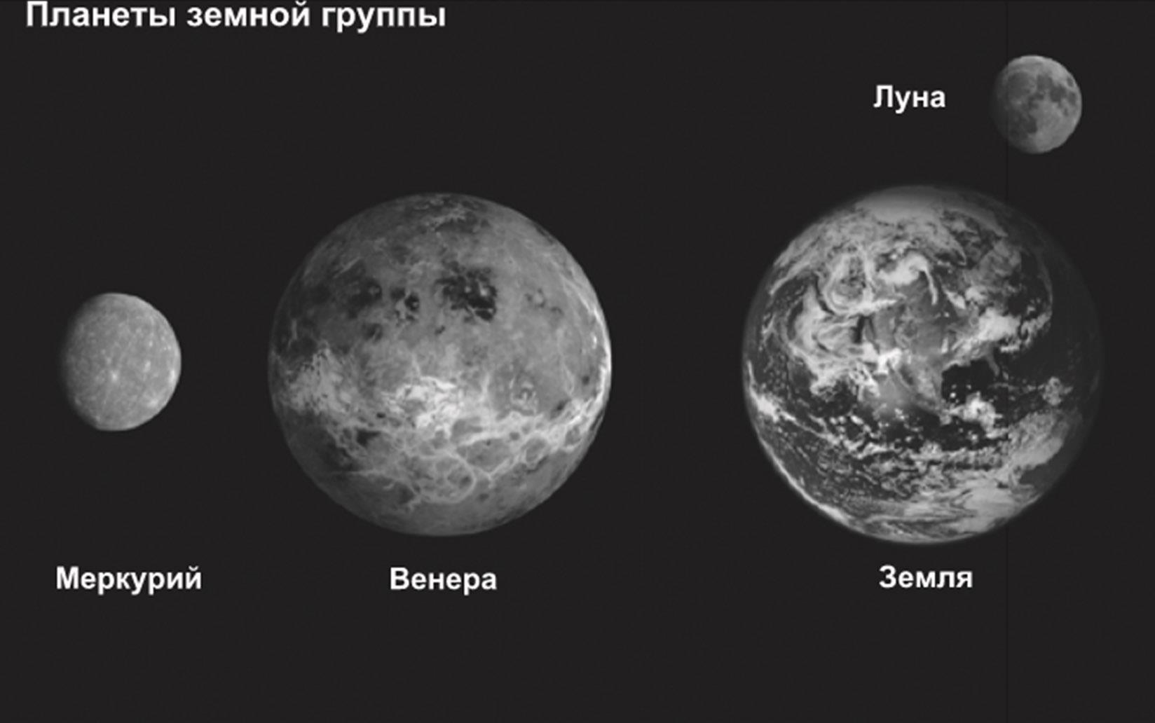 На этом изображении мы можем видеть сравнительные размеры Земли, Венеры, Меркурия и Луны
