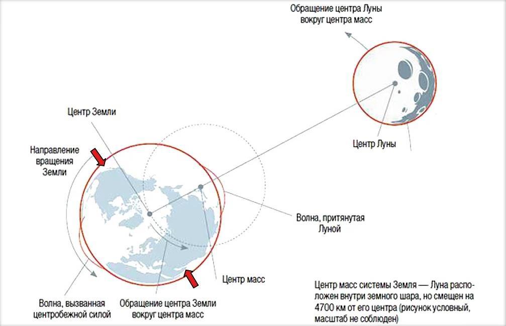 Может показаться, что это просто мнение какого-то левого чувака в интернете, но на самом деле, механизм разогревания ядра планеты спутником легко объясняется. Дело в том, что при наличии большого спутника, планета уже вращается не только вокруг своей оси, но и вокруг общего центра масс. На этом изображении пунктирной линией вы можете видеть траекторию вращения нашей планеты вокруг центра масс, из-за чего у нас возникают приливы и отливы. Но это на поверхности возникают приливы и отливы, а внутри планеты возникают колоссальные силы трения из-за постоянной деформации.