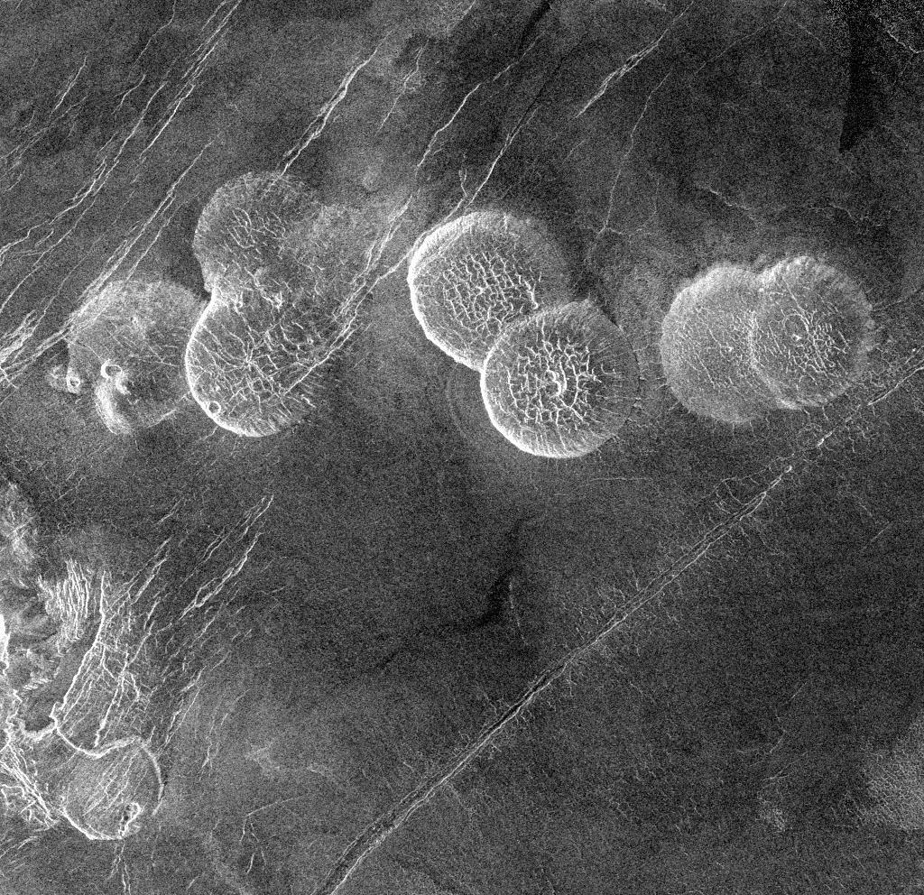 На самом деле, эти "блины" и есть вулканы Венеры. Такую форму они получили из-за сверхплотной и тяжёлой атмосферы, которая буквально их раздавливает в лепёшку. Вся поверхность Венеры состоит из таких лепёшек и лавовых равнин.