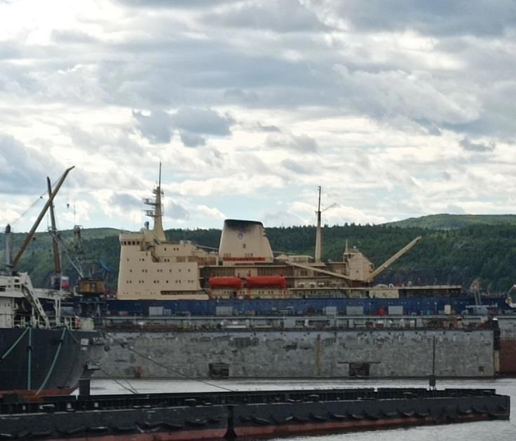На его фоне в доке посреди Кольского залива ремонтируется современный ледокол: )