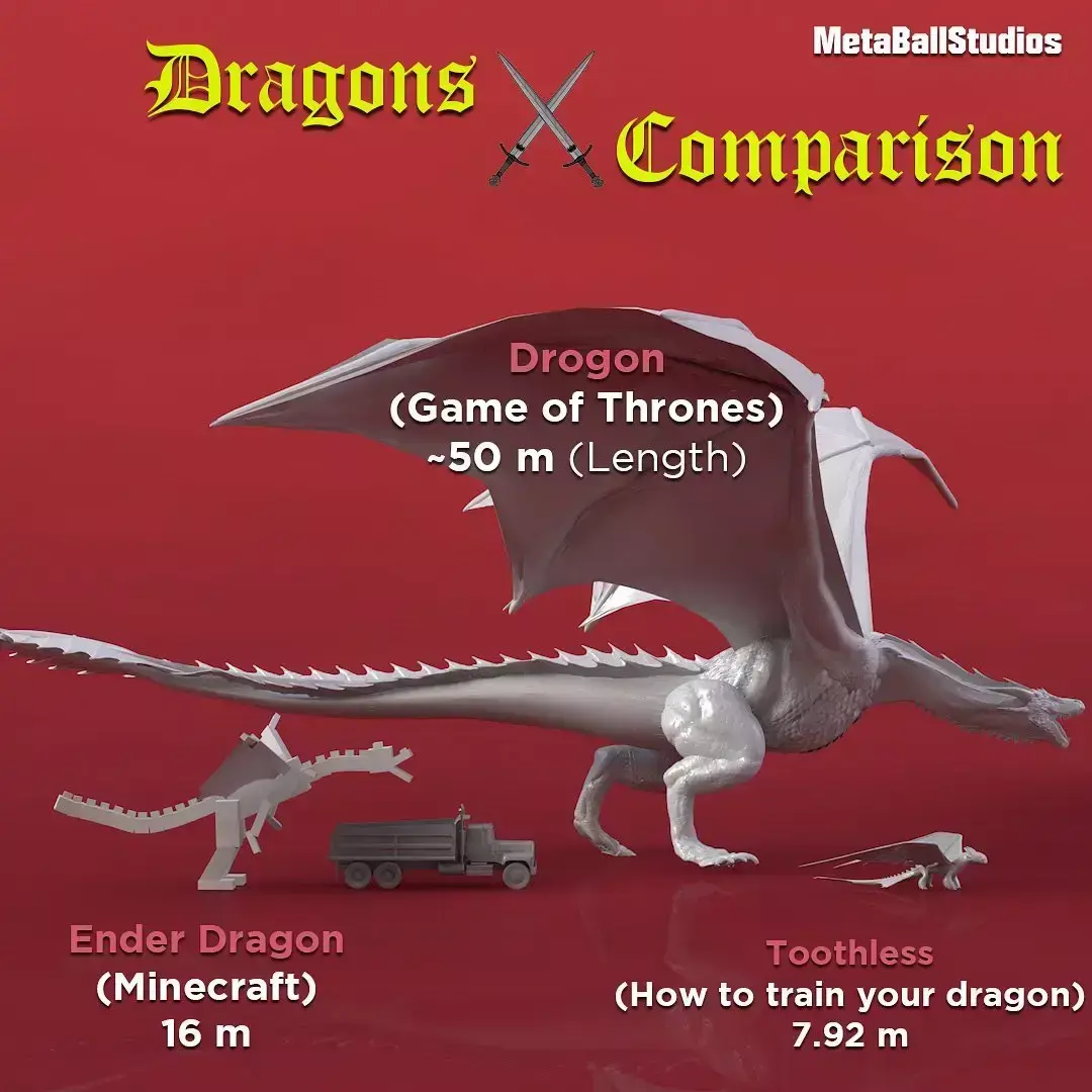 Сравнение размеров драконов из нескольких литературных, игровых и кинематографических источников на фоне грузовика