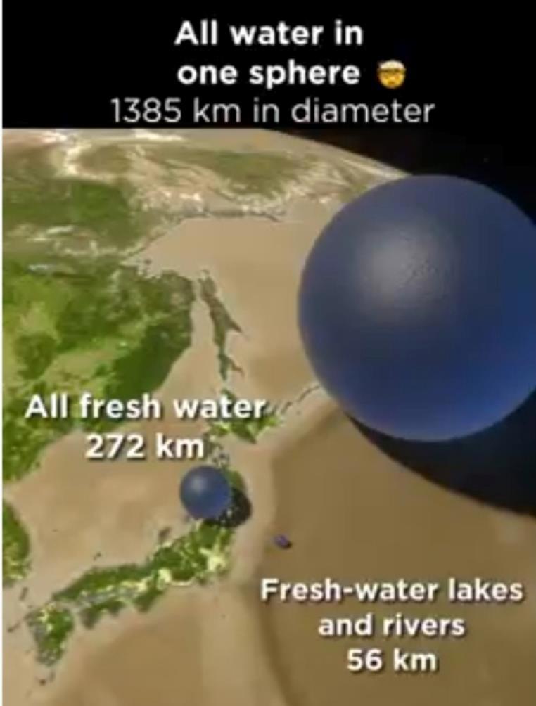 Вся питьевая вода вода поместится в сфере 272 км в диаметре. А вода всех рек и пресноводных озёр в сфере диаметром 56 км