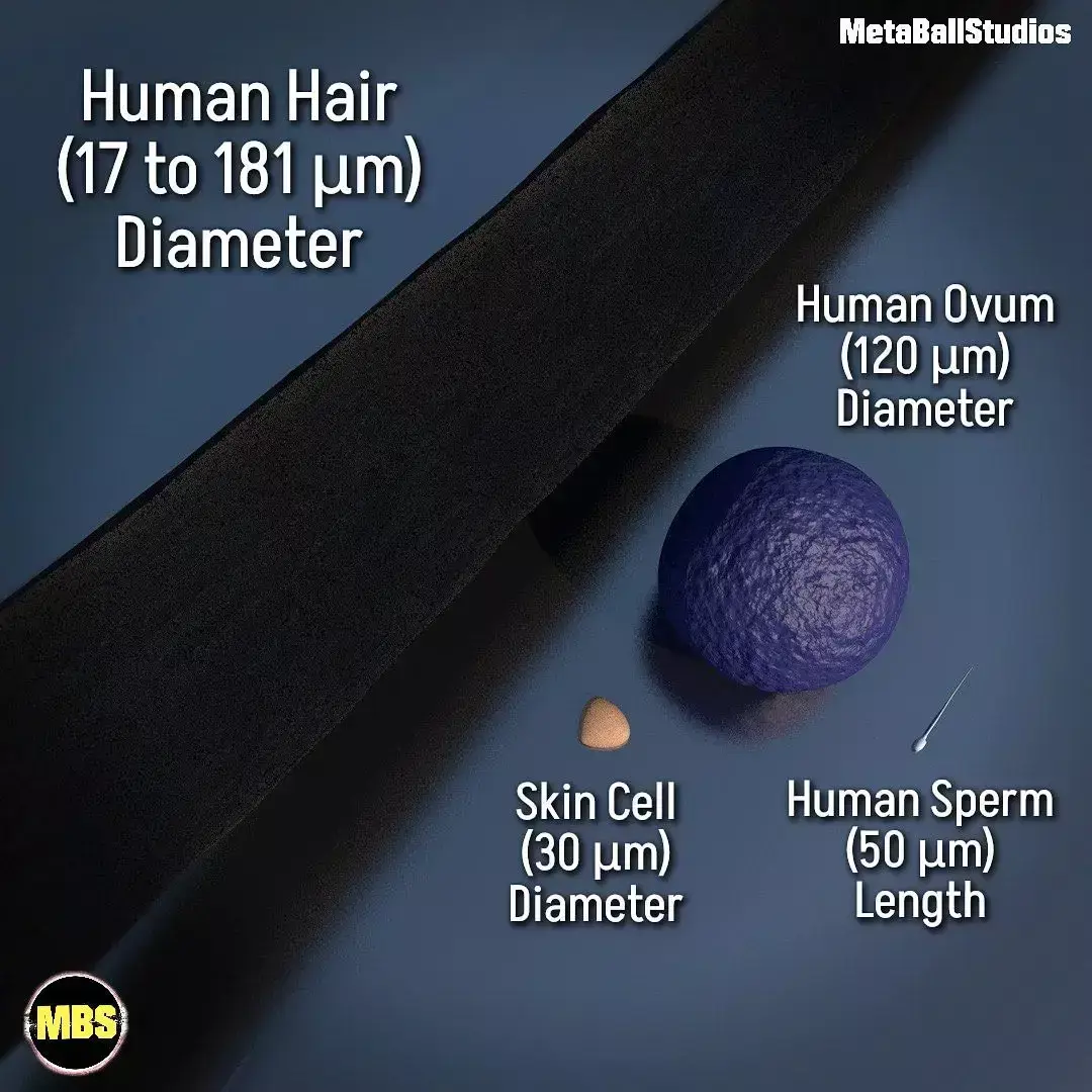 Некоторые Размеры биологических объектов в  человеке (клетка кожи, яйцеклетка, сперматозоид) на фоне волоса