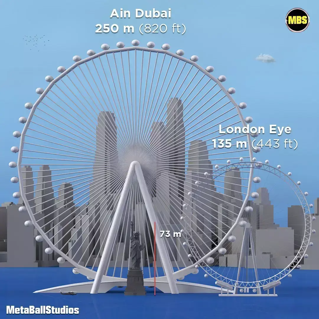 Визуальное представление Самых больших колёс обозрения и Статуи Свободы на фоне мегаполиса.