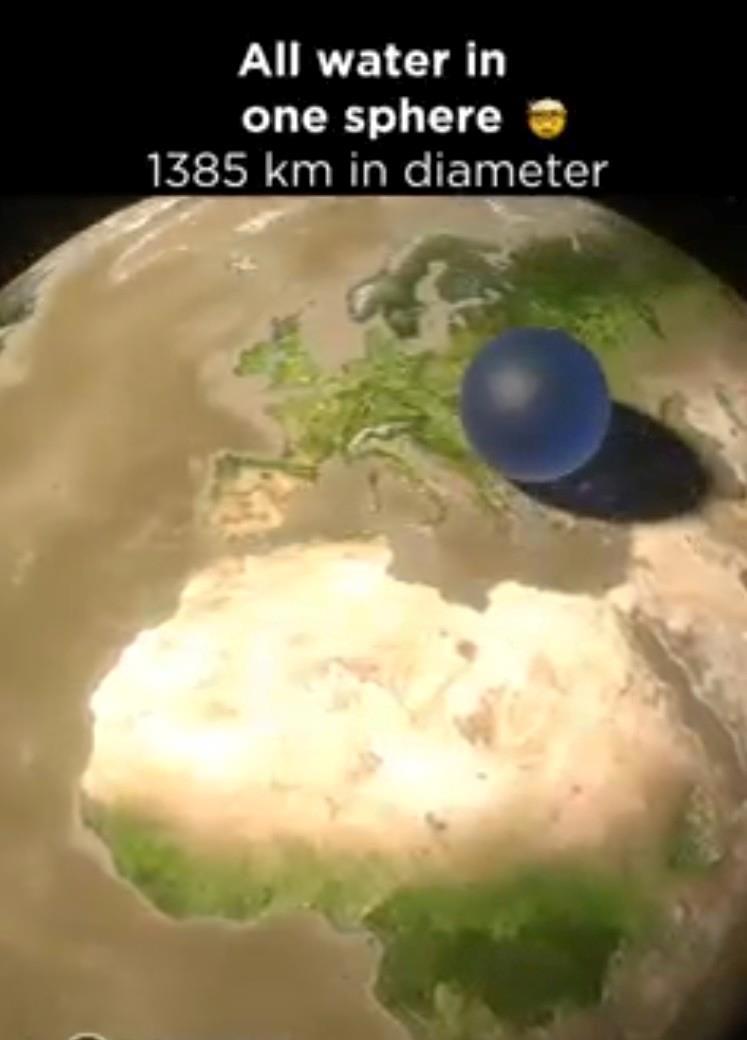 Вся вода поместится в одной сфере диаметром 1385 км (Общий объём воды на Земле — 1,3–1,4 млрд км³)