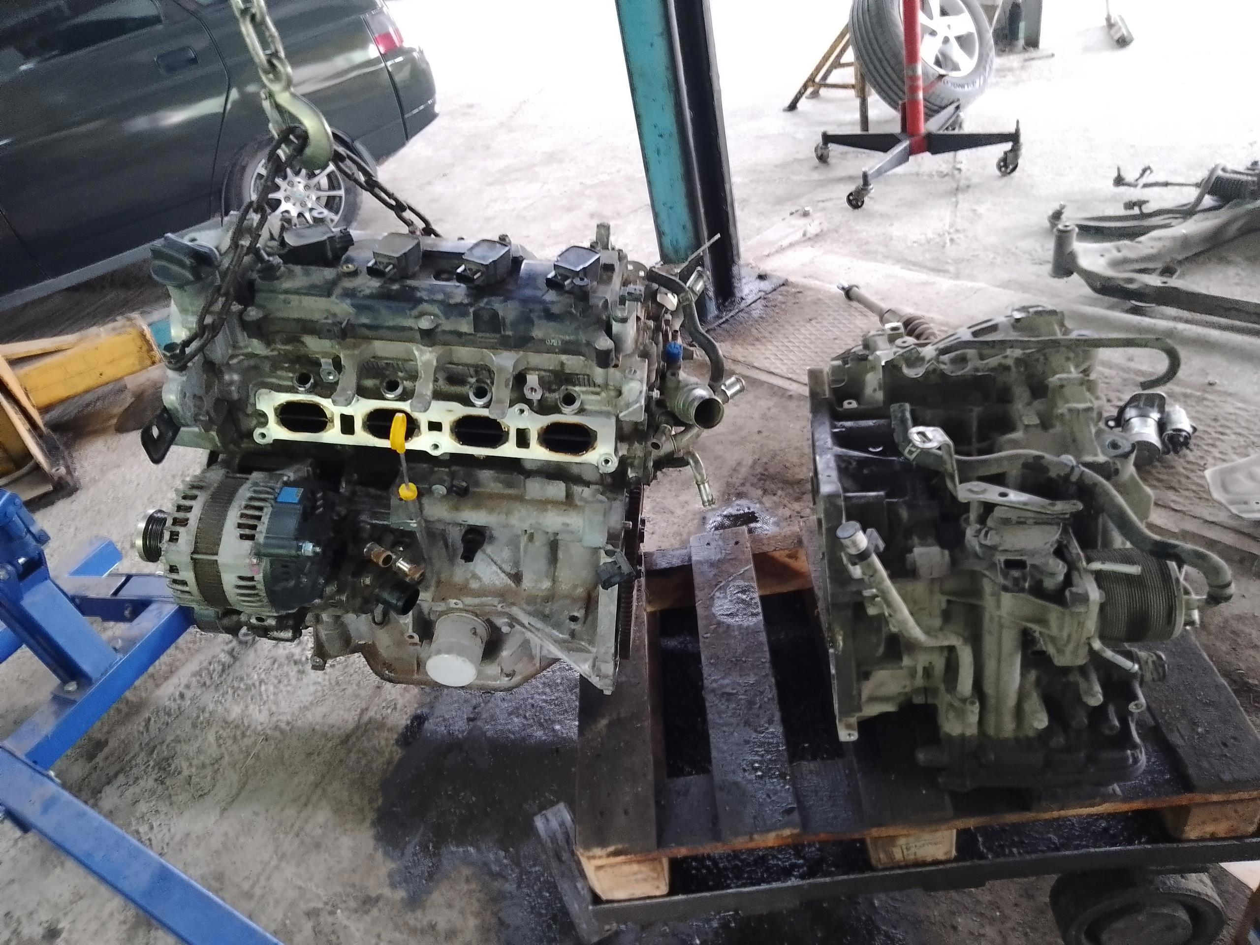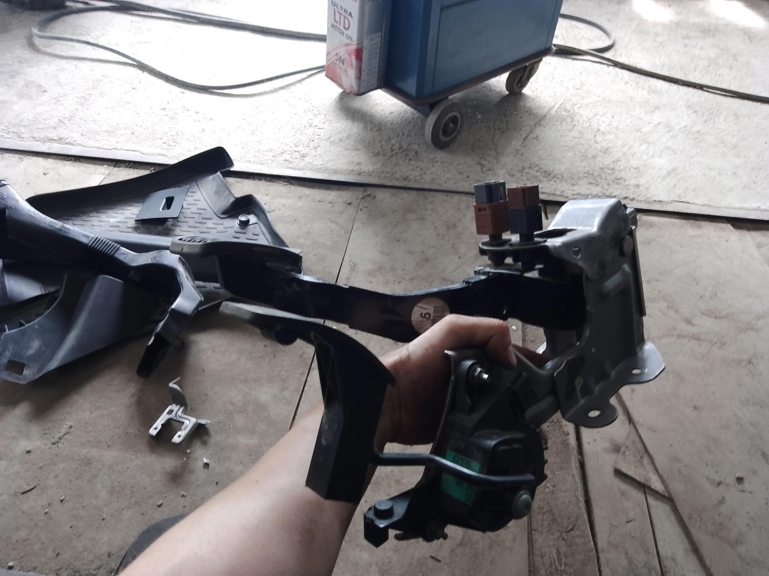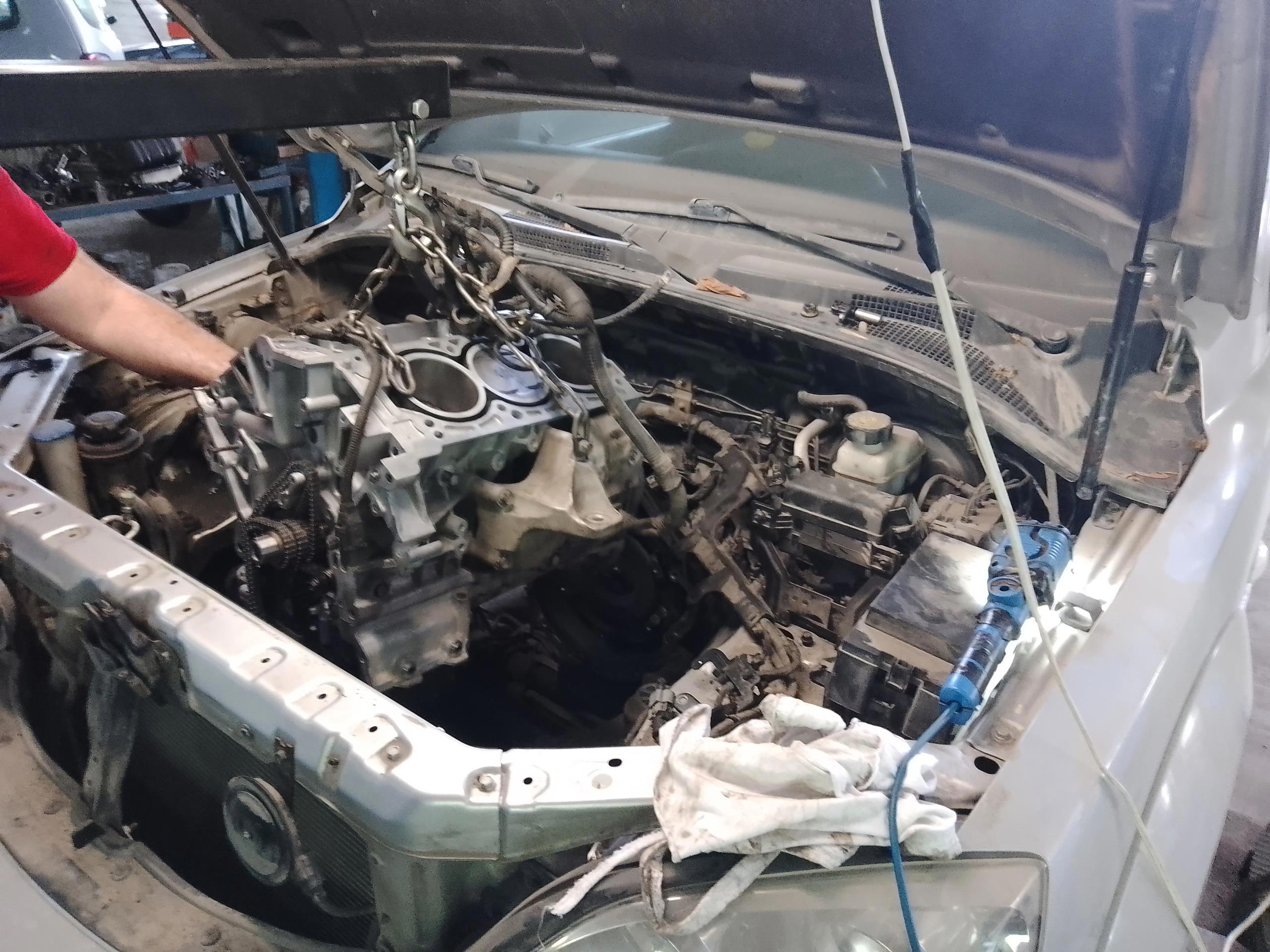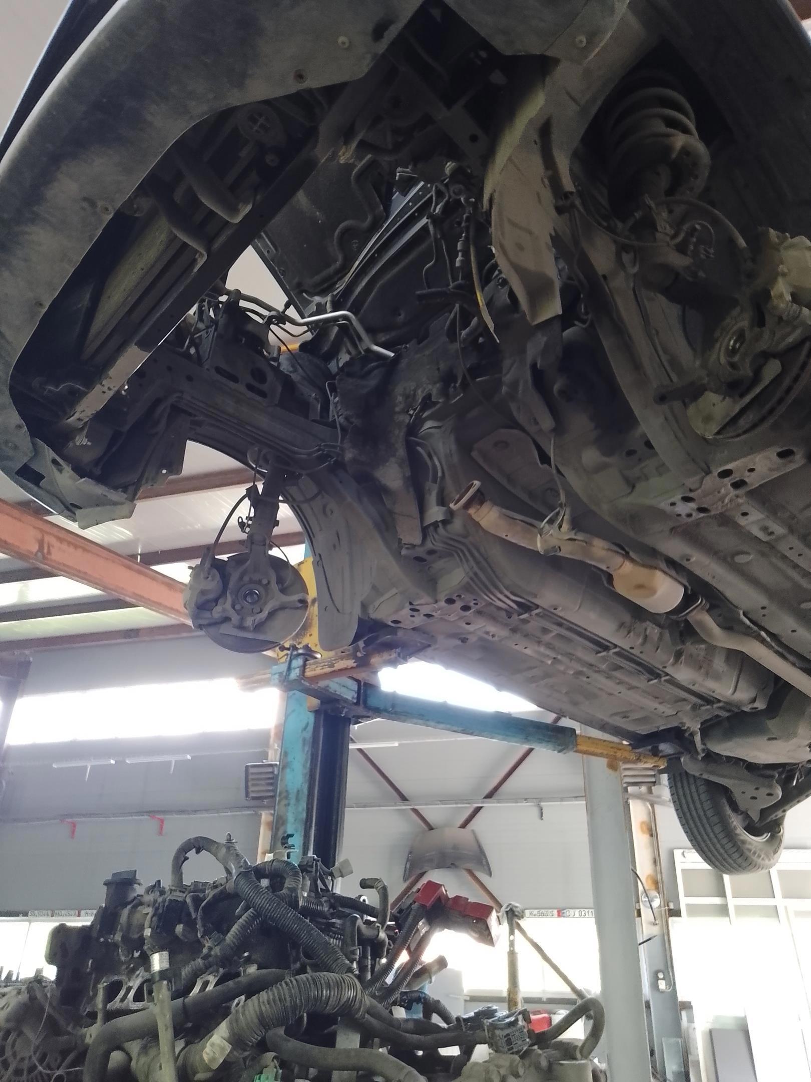 Отцепив мотор от кузова, разъединеяем проводку, там ничего хитрого, коса остается на моторе, надо вынуть 3 разъёма из подкапотного блока предохранителей, и два разъёма с плюсовой клеммы. Далее отцепляем рулевой вал от рейки в салоне. Там какая-то хитровыделанная гайка, у меня эта байда просто развалилась, а потом я плакал, когда собирал наместо. Есть простые крепления, но нет! Надо придумать какую-то залупу! Простите. Но это так и есть. Отцепляем стойки стабилизатора, нижние рычаги и рулевые наконечники от поворотных кулаков, откручиваем нижнюю подушку двигателя, и скидываем подрамник. Он нам пока не нужен. По сути, мотор готов к изъятию. Компрессор кондея оставили на машине, чтоб не сливать фрион (ибо сливаем мы его в атмосферу, откачки нет, и потом заправлять кондей это плюс к цене для клиента, но мы клиентоориентированные), и как оказалось - не зря. Управление кондеем на новом моторе отличается, там 2 разъёма, у нас 1. Выкидываем мотор.