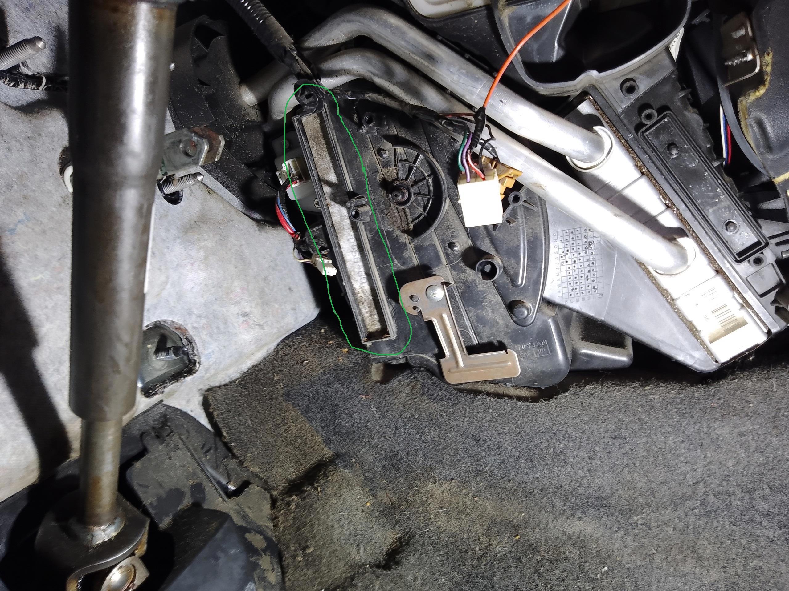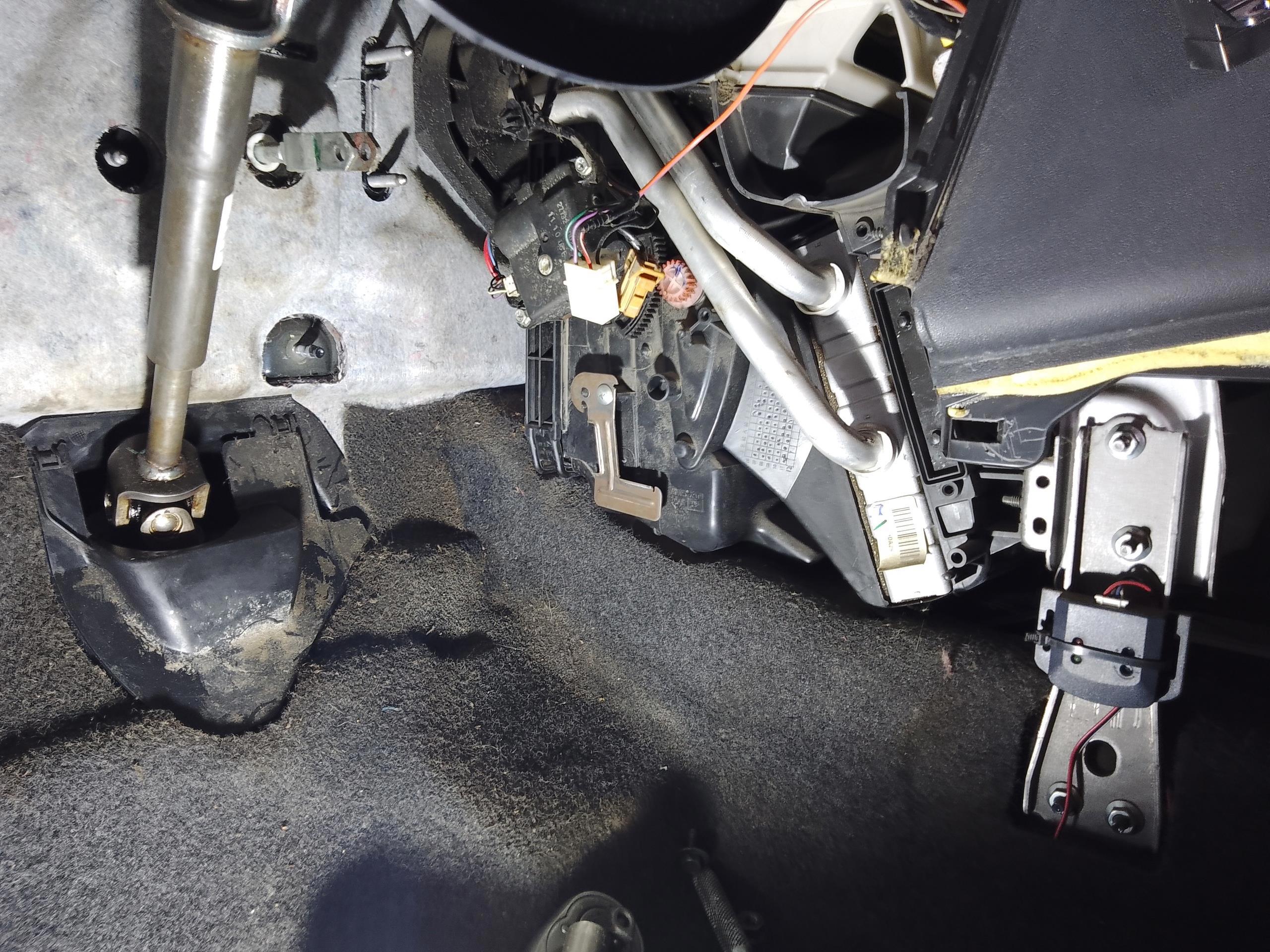 Вы думали это всё?? Как бы не так! Выдергиваем пластик у правой ноги водителя, и видим механизм управления заслонками печки. Нам его надо снять!