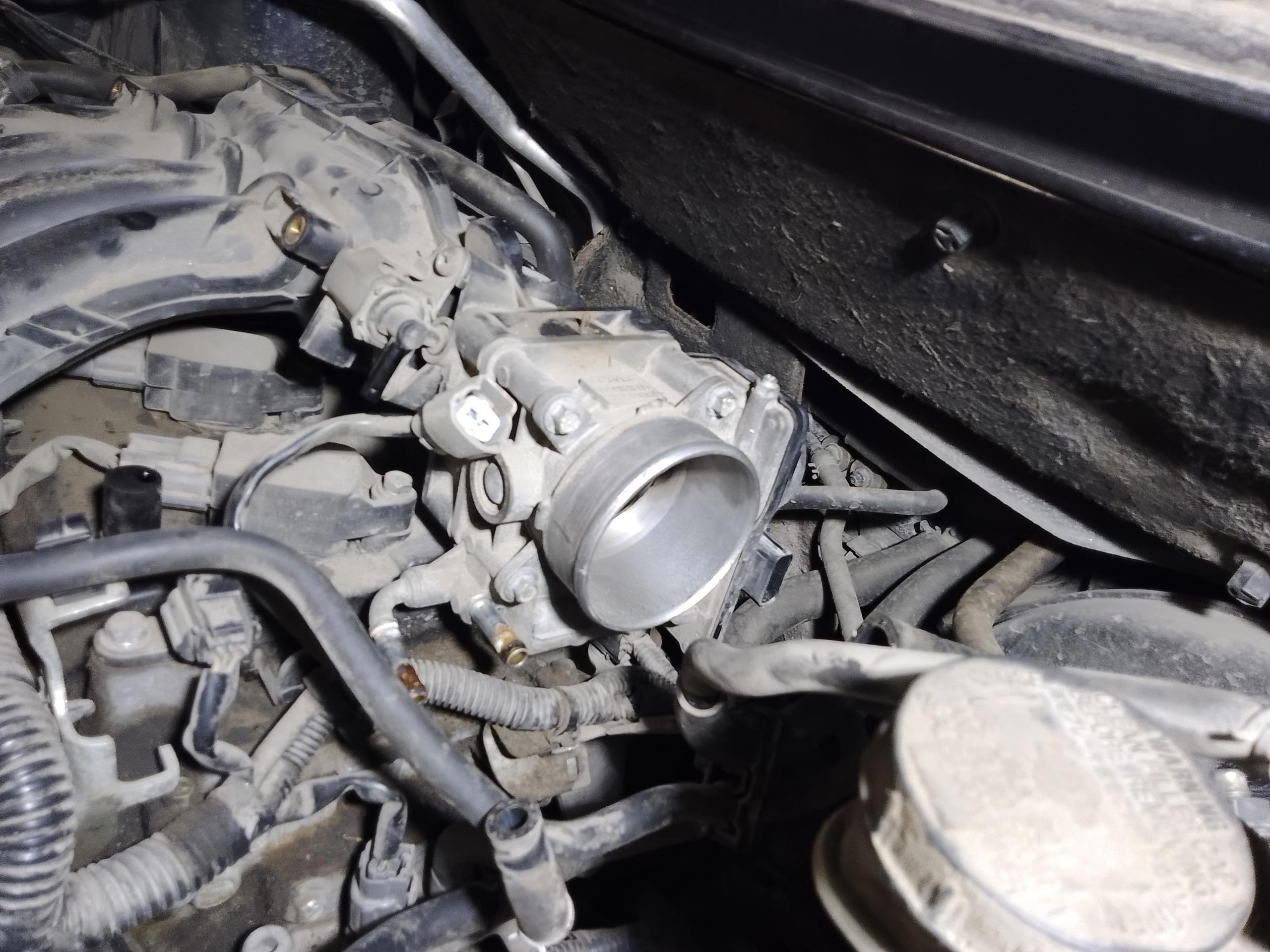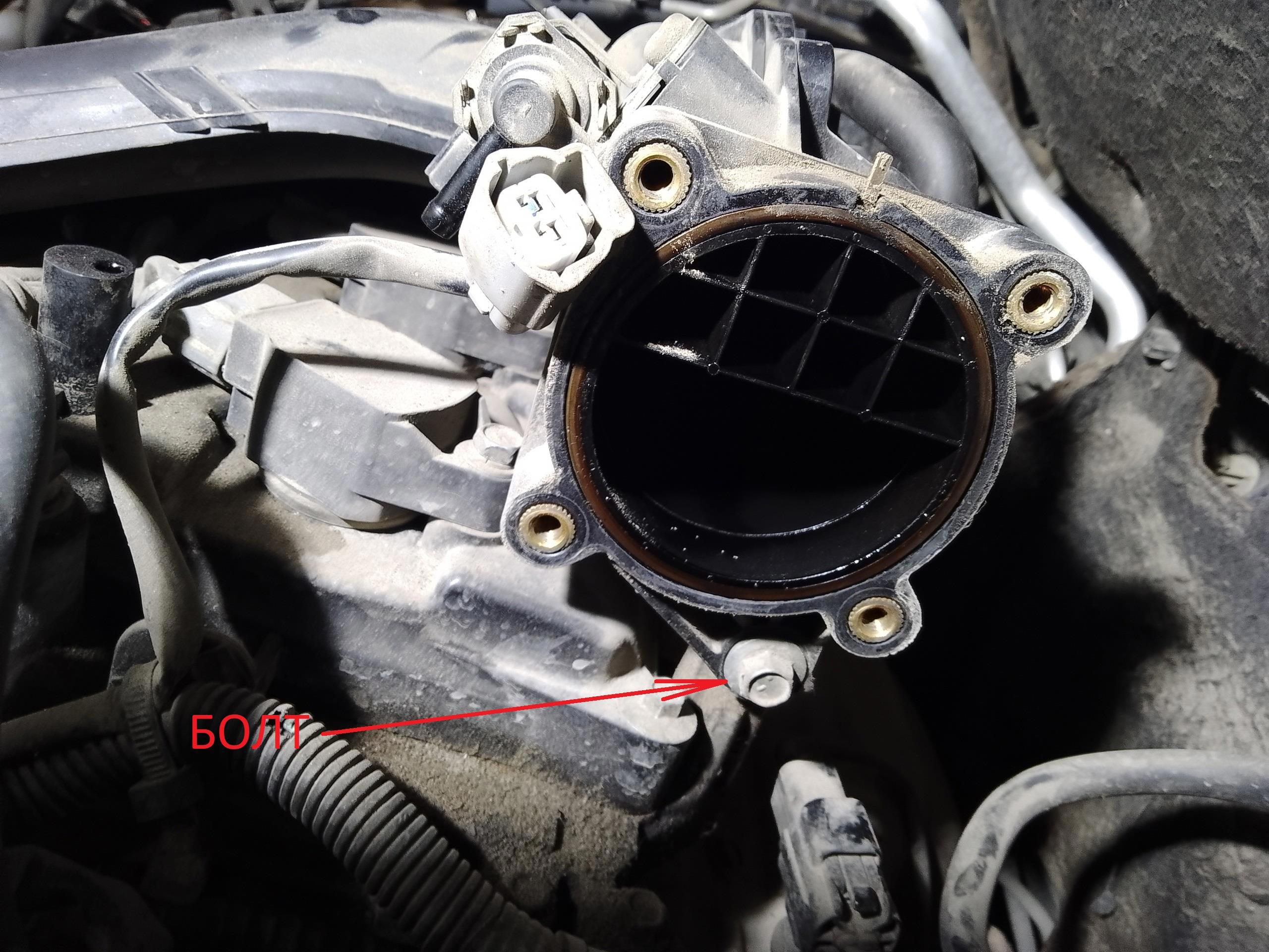 Снимаю впуск, и обнаруживаю приколюху: болт, который прячется ЗА дроссельной заслонкой. Тоесть, впуск не внимая отдельно дроссель не снять. А впуск надо снимать каждый раз при замене свечей или катушек.