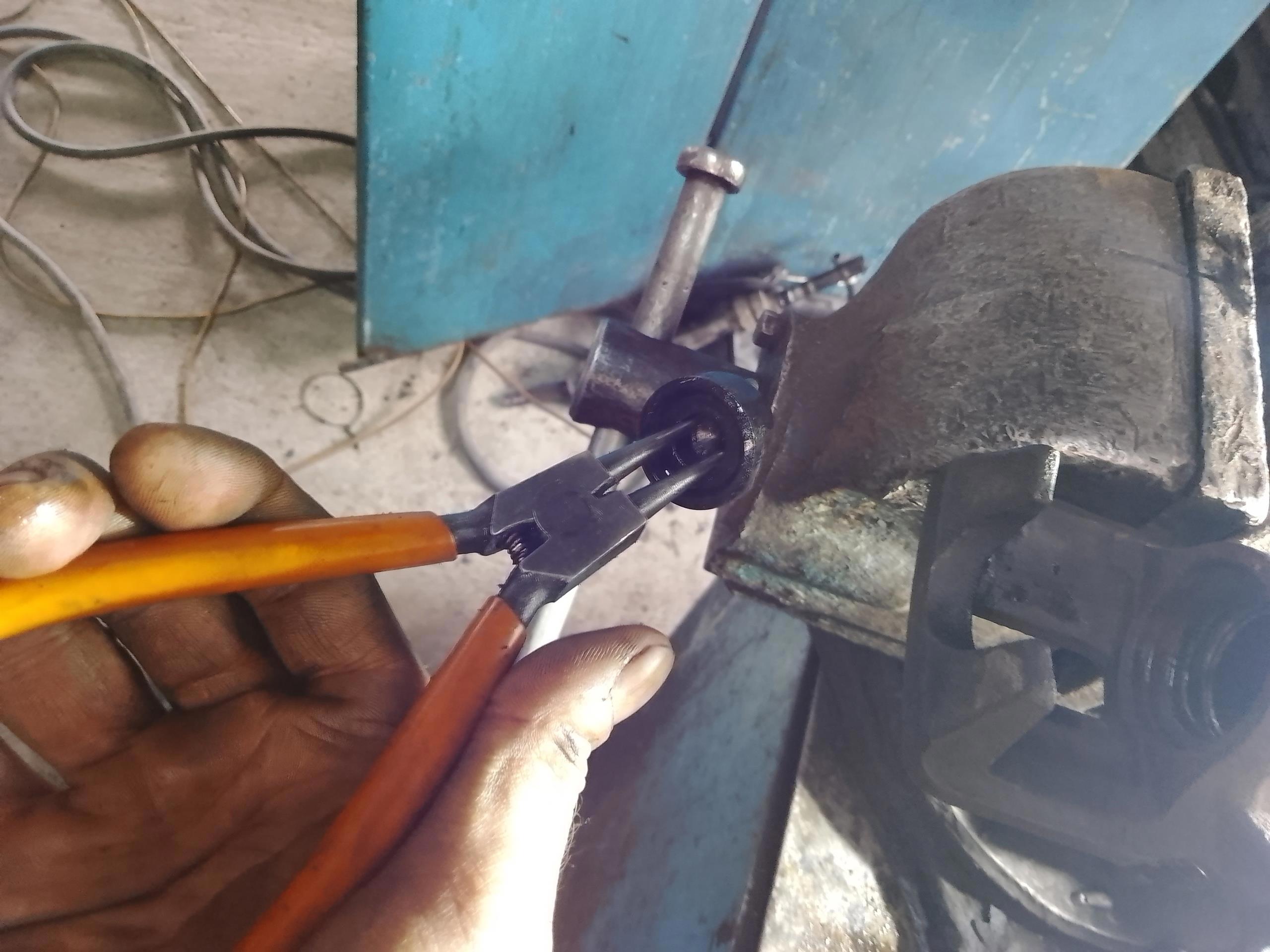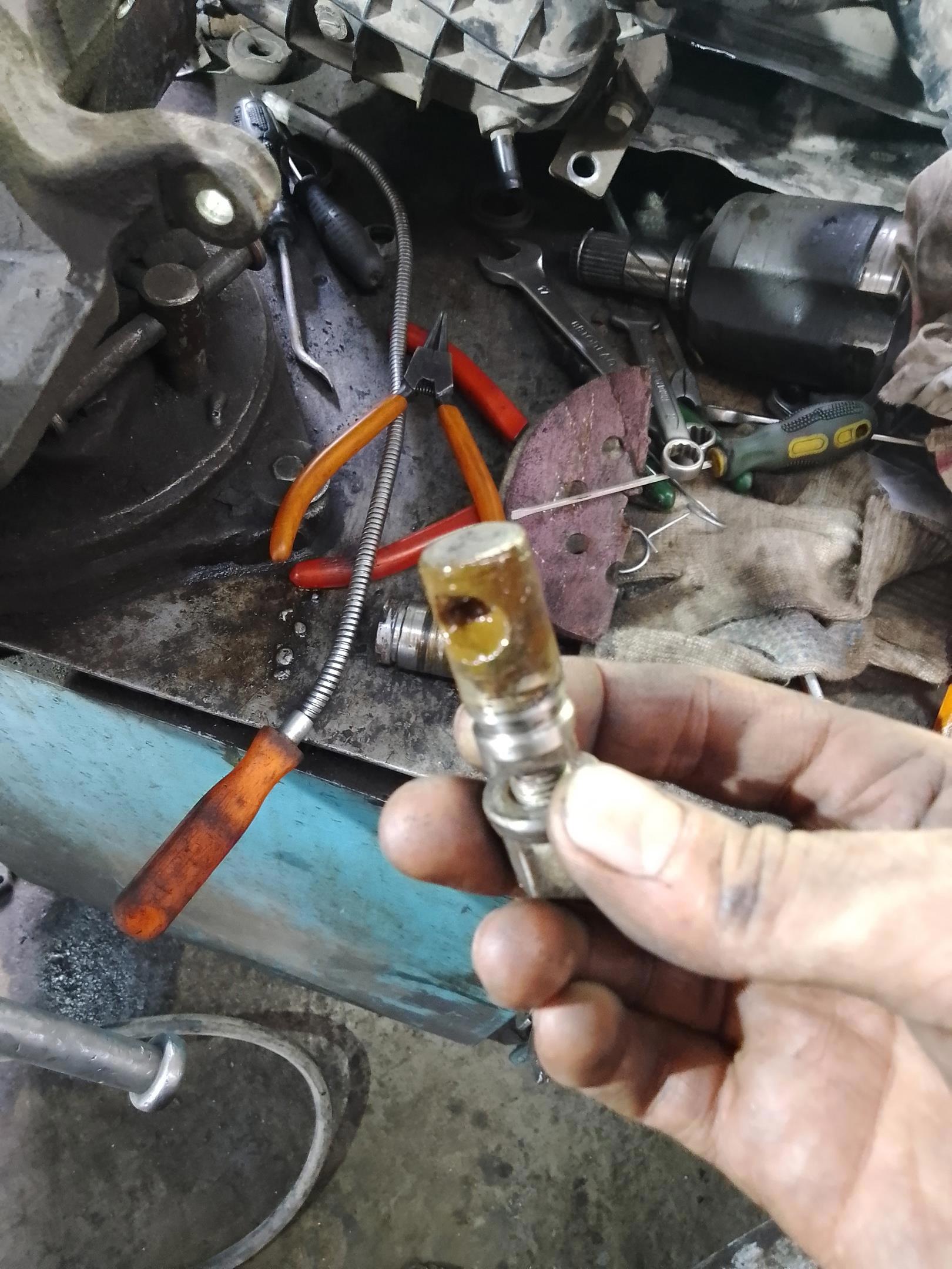Затем я долго ломал голову, как дальше-то это всё разобрать?? Штудирование интернета и просмотр ютуба результатов не дал. Ладно! Подключим инженерное мышление! Взял инструмент для снятия стопоров, который при нажатии на рукоять раздвигал усы, и извлек вот такую штуку из-под поршня.
