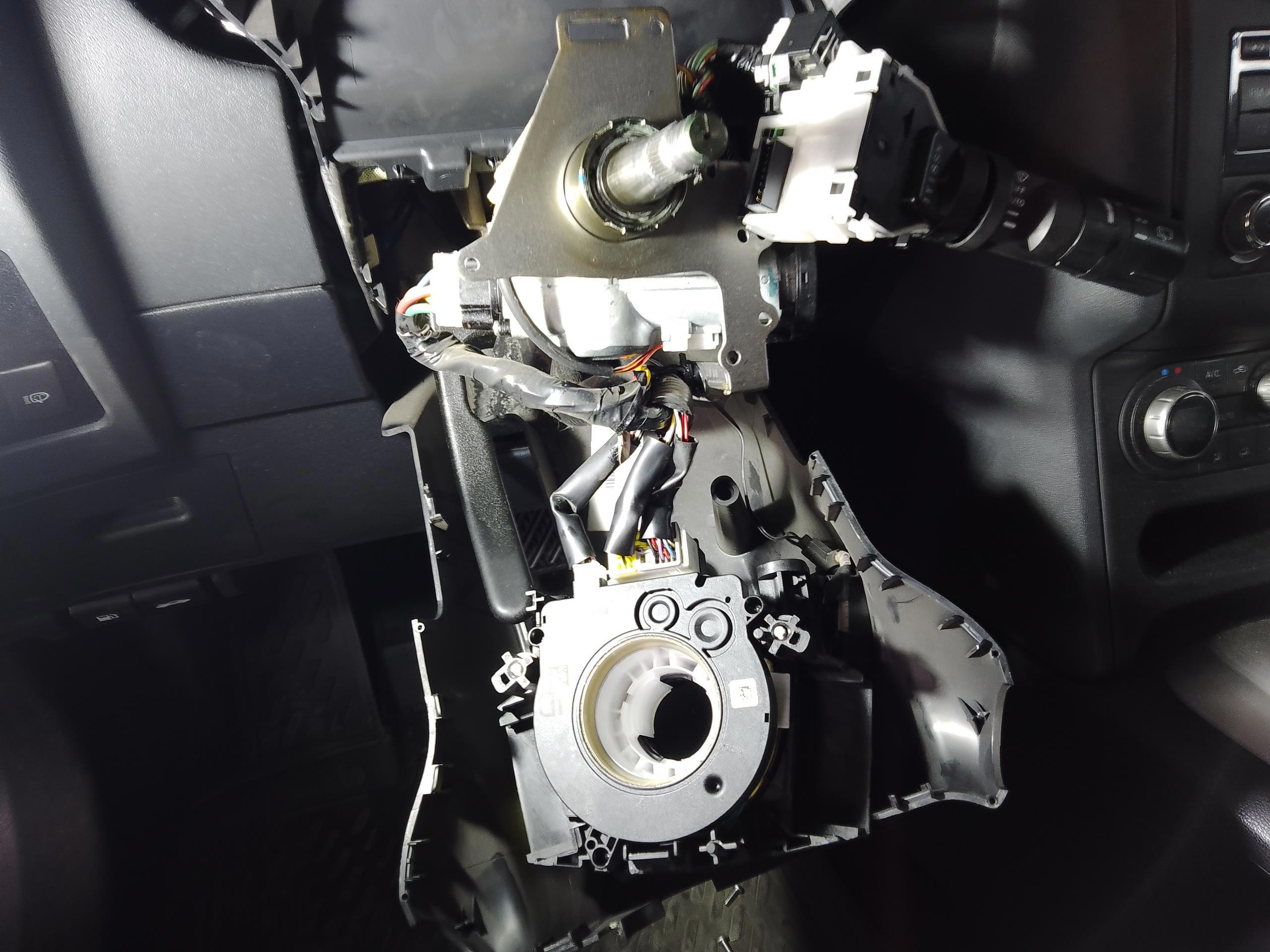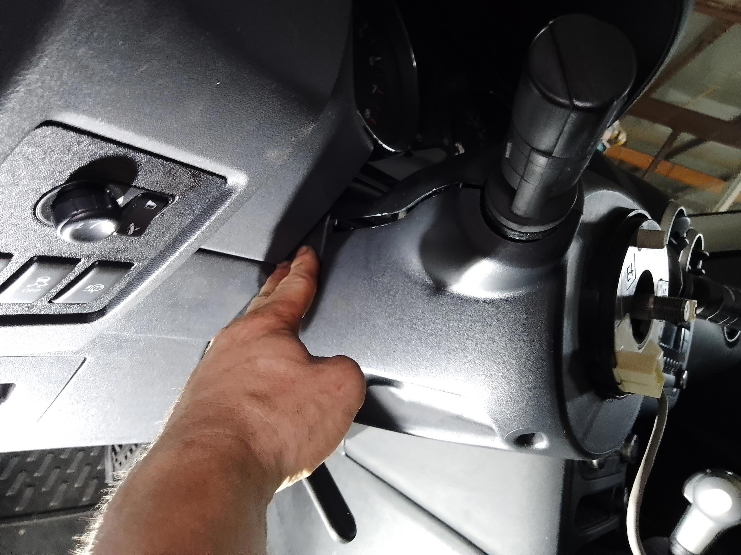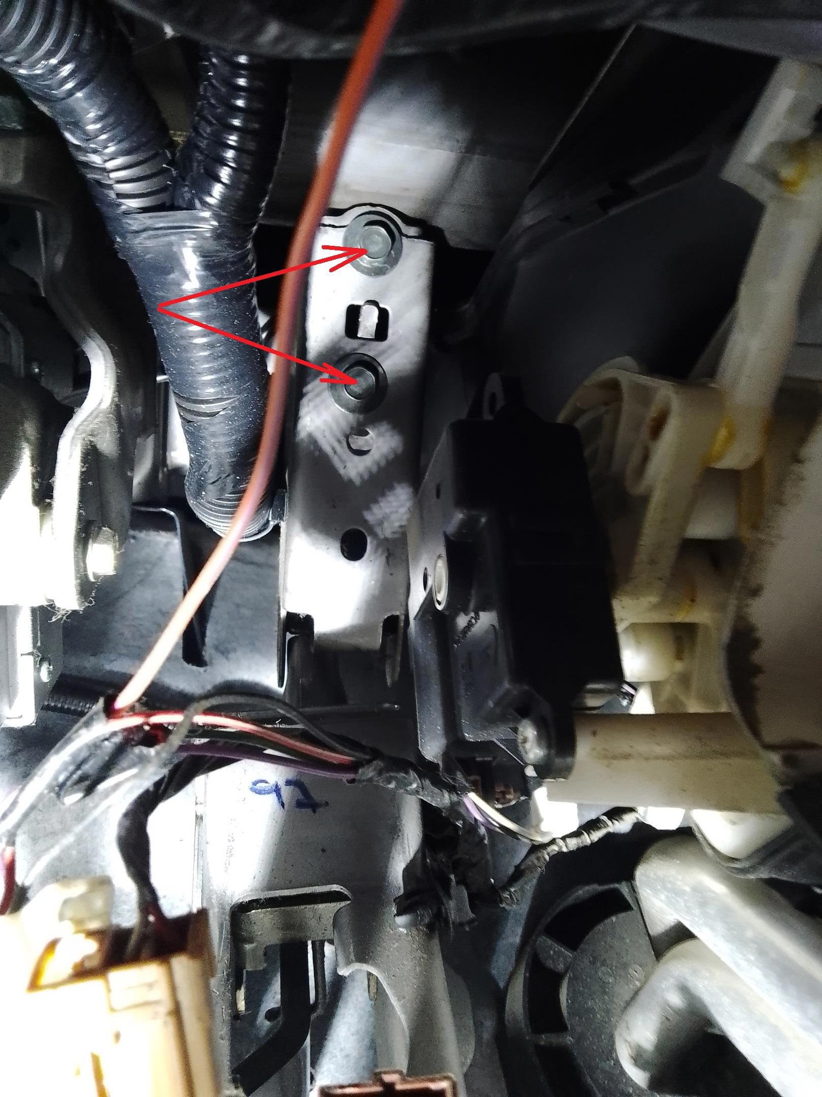 Далее откручиваем три винта снизу кожуха рулевой колонки, и нажимая на его нижнюю часть внутрь вот в этом месте располовиниваем.