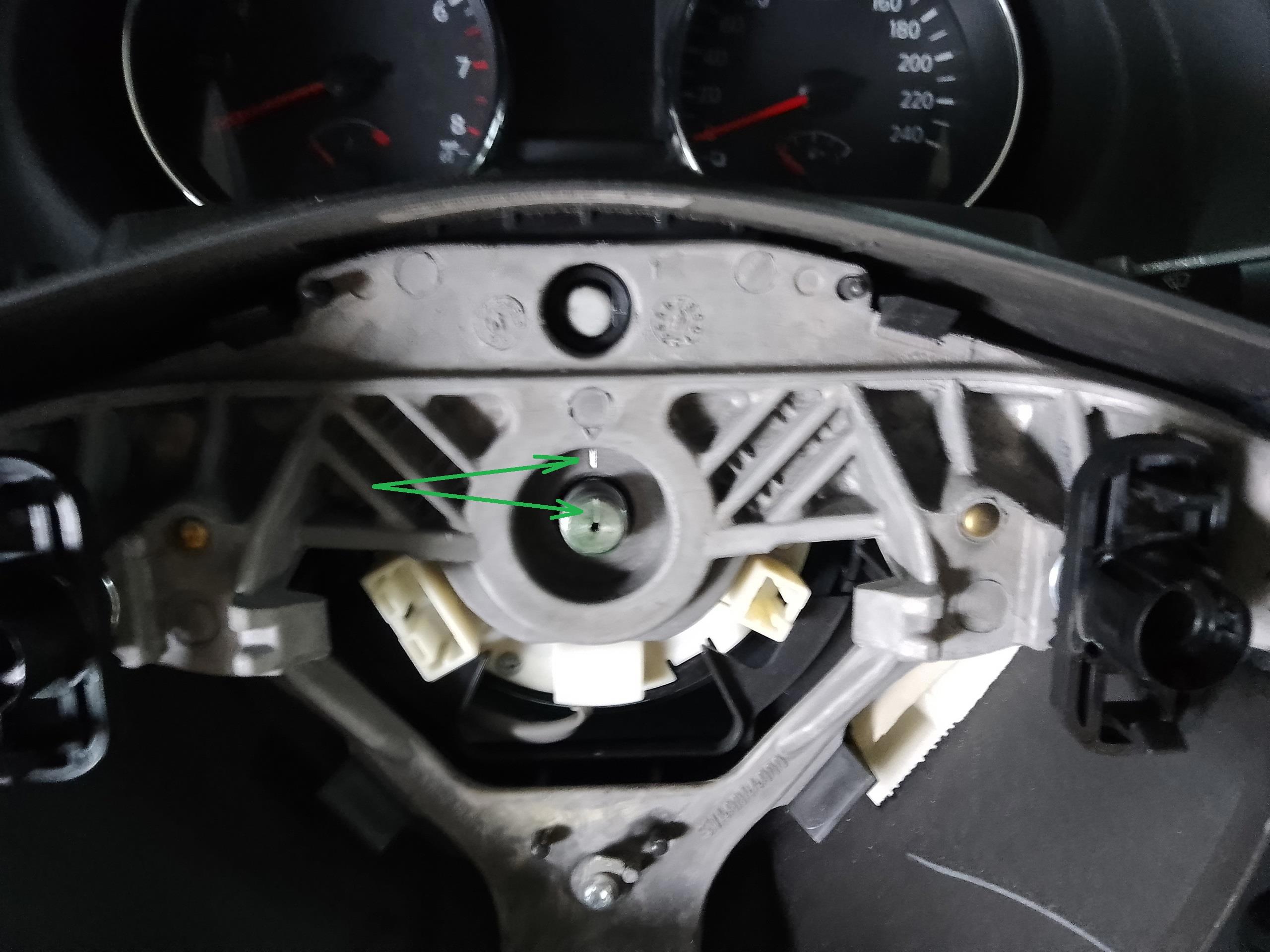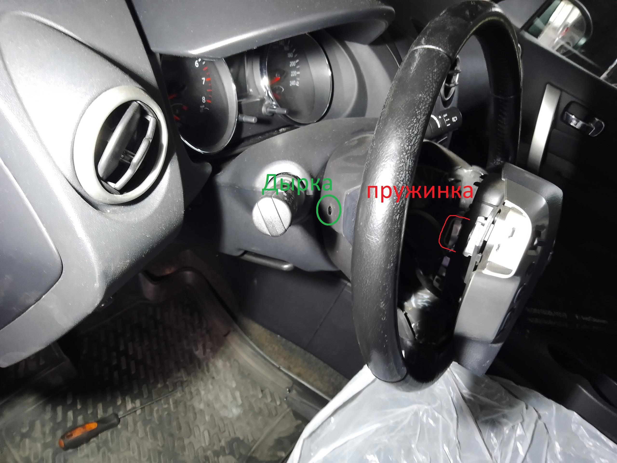Собираем всё в обратном порядке. Это дорогая процедура, которую можно было сделать ЗНАЧИТЕЛЬНО проще, но очередная обезъяна (а может и та же самая, почерк-то сходный) заработала себе премию. Ибо эта процедура у оф.дилера стоит приличных денег. Но это не гарантирует, что фильтр не засунут вам левой ногой без снятия педалей. Дальше на очереди замена подрулевого шлейфа. Для этого надо сначала снять подушку, для чего есть две дырочки сбоку руля, через которые надо отщелкнуть пружинное крепление подушки. Немного сноровки, и всё получится. Я отжал их плосской отверткой, поставленной поперек пружинки.