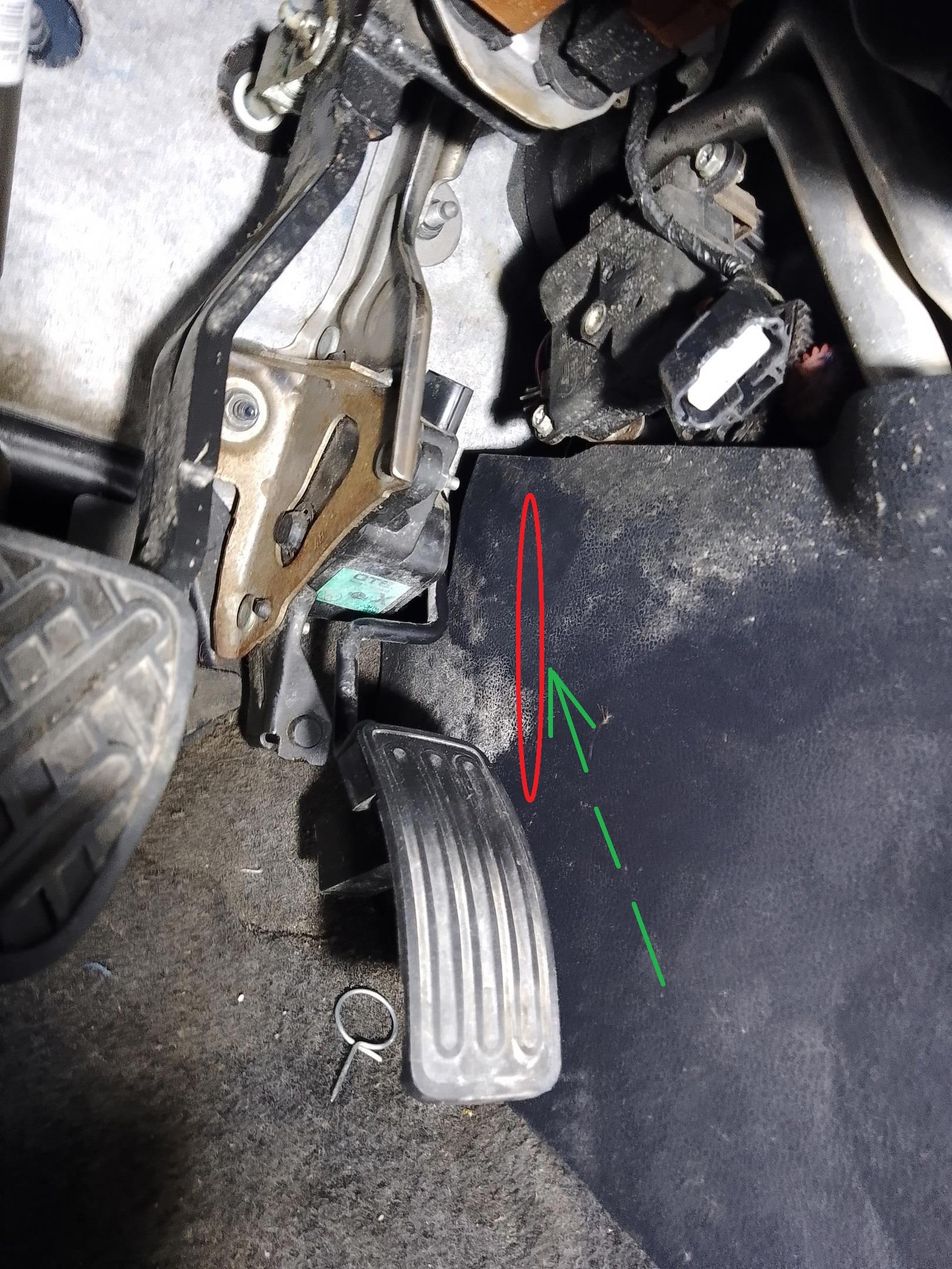Чтение интернетов подсказало, что он со стороны ног водителя, и для его замены надо снять педали. Ну, ладно. Снять так снять. На Форде все такое видели. Открутил педали, а они _не_выходят_. Вообще. Надо открутить упор педали тормоза, за который вся эта приблуда цепляется и не вылазиет. Ладно! Как оказалось, начинать надо с пластиковой накладки на порог. Потом накладка у левой ноги, затем нижняя часть панели приборов, за ней выоздуховод, и только потом мы увидим этот гребанный упор. И это не всё на фото.