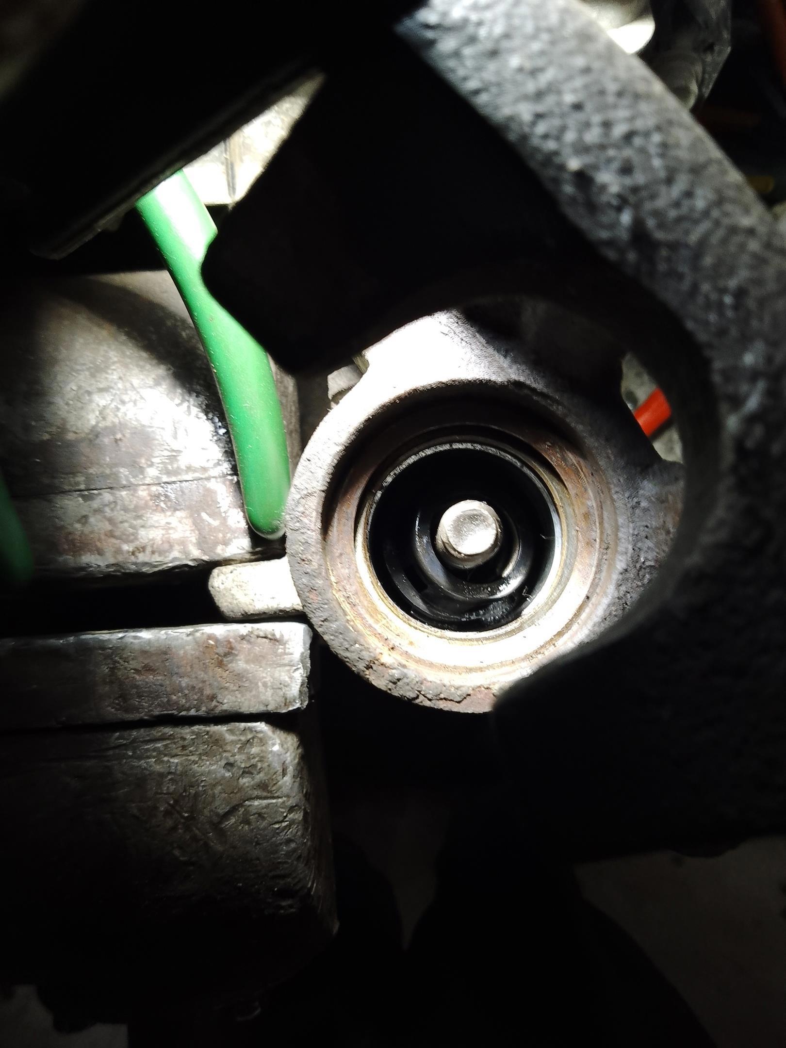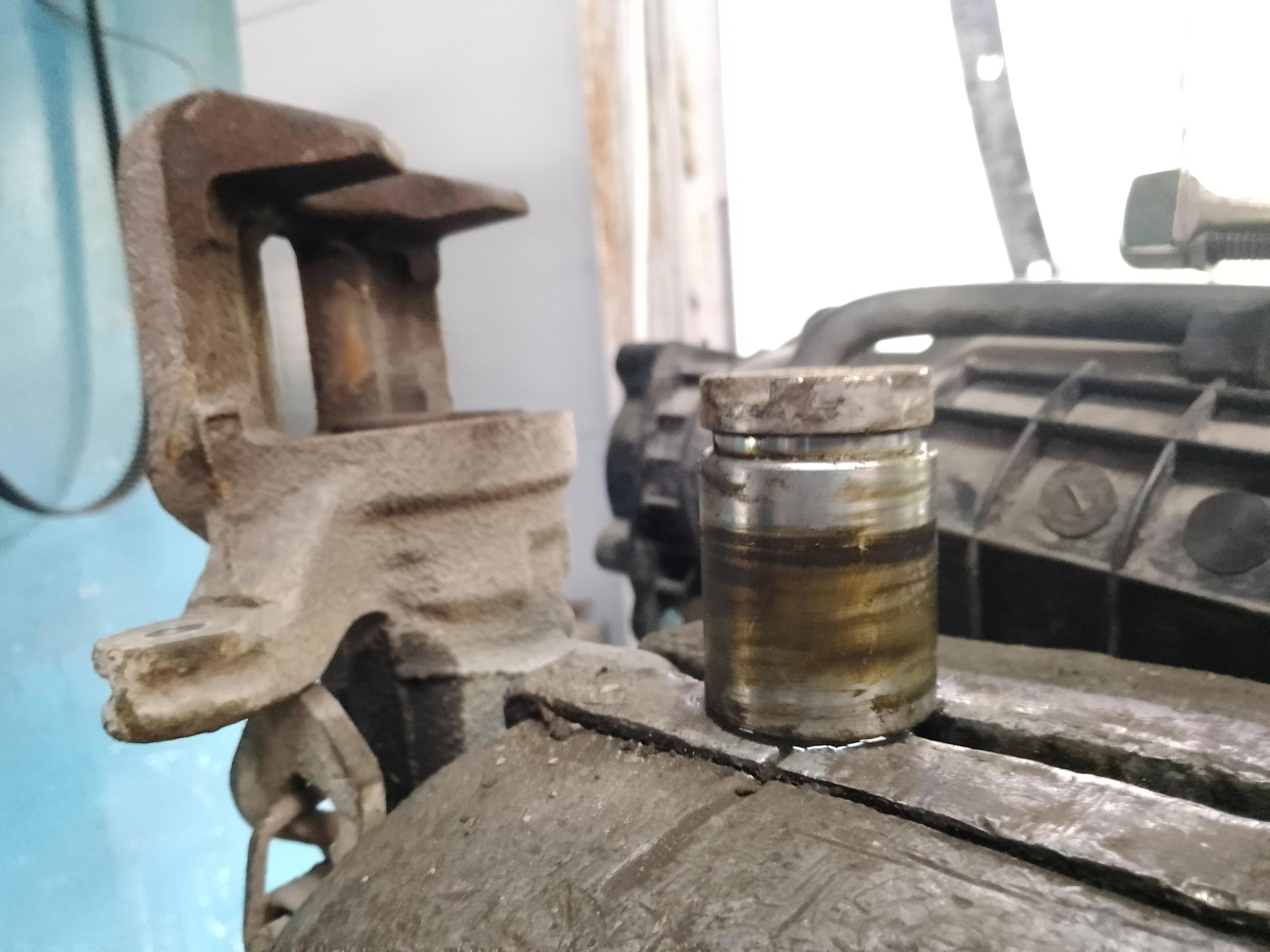 Фух, закончили с Кашкаем... Наверное, не плохой автомобиль, если на нём только ездить, но ремонтировать его в некоторых местах та ещё морока. Переходим дальше. Хонда Джаз, жалуется на механизм ручника. Проверяем. Да, ручник не работает на правом заднем колесе. У нас есть комплект резинок, новый поршень, и несокрушимая решительность это починить. Разбираем. Вынули поршень - грязноват, но не виновен.
