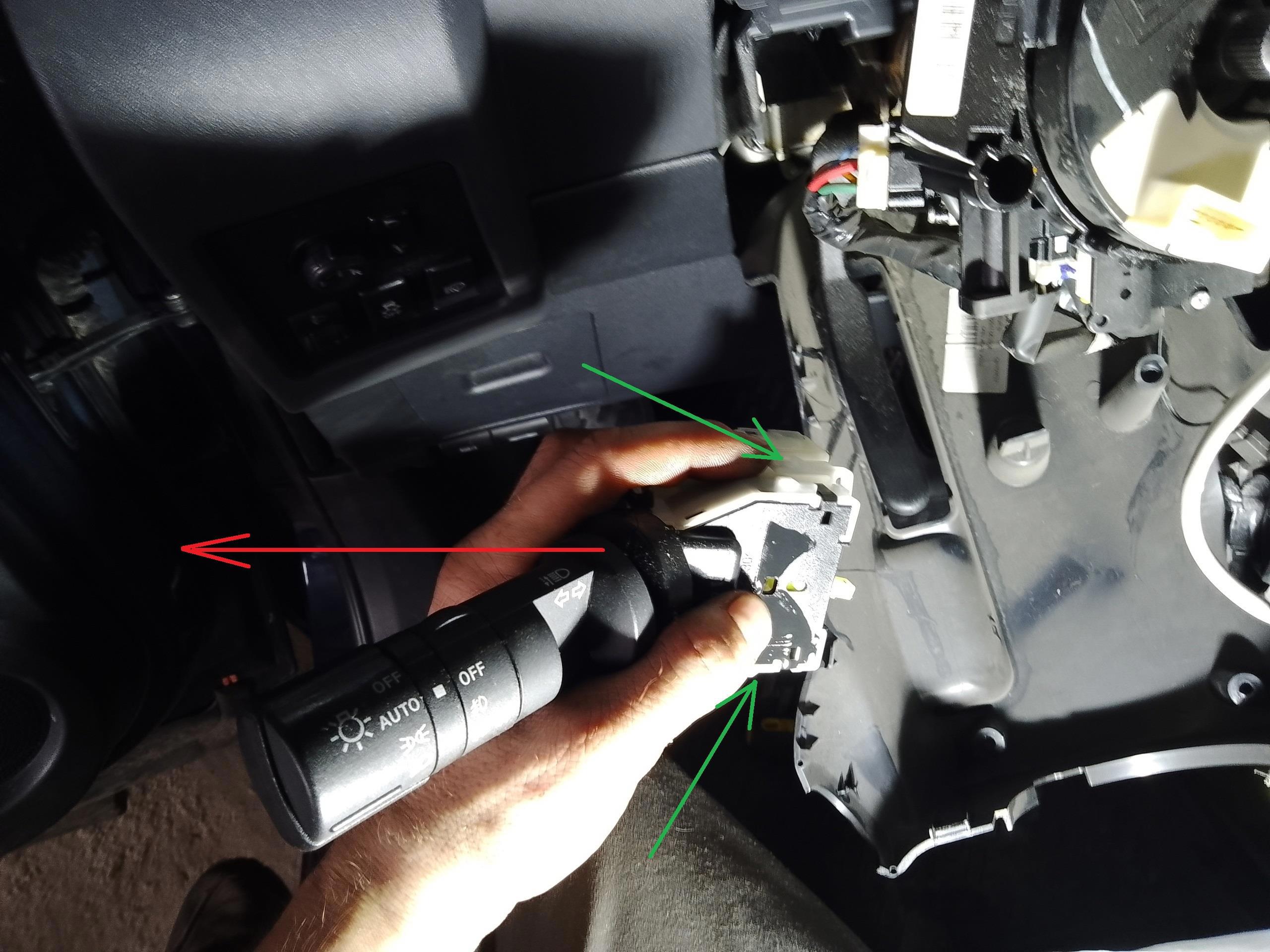 Снимаем рычаги поворотников и дворников, для чего надо нажать на фиксирующие усики сверху и снизу, и вытянуть рычаг от колонки.