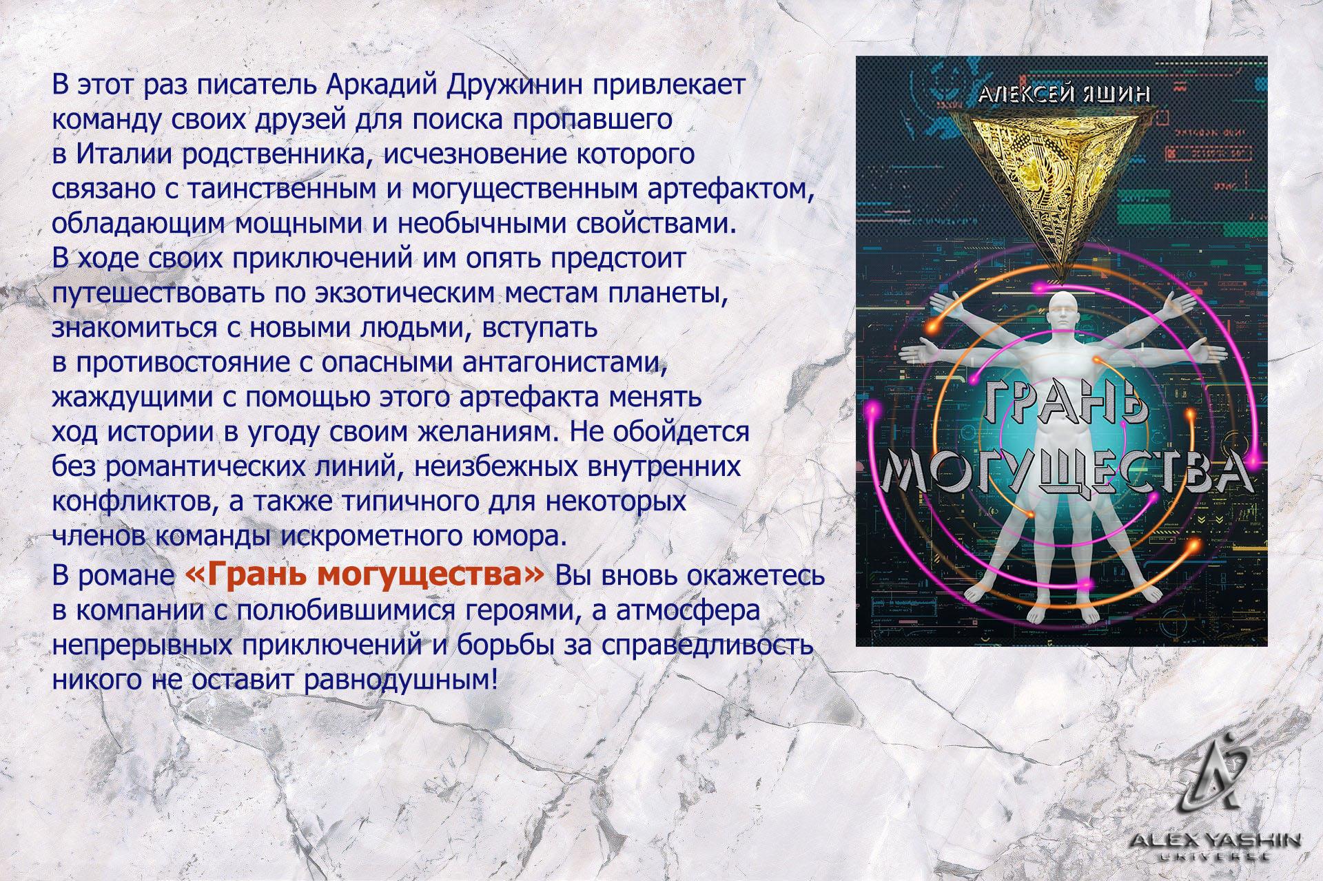 Автор: Алексей ЯшинУважаемые любители приключений! Завершена выкладка второй части приключенческой трилогии. В романе "Грань могущества" вы вновь встретитесь с полюбившимися многим героями, а водоворот захватывающих событий никого не оставит равнодушным.