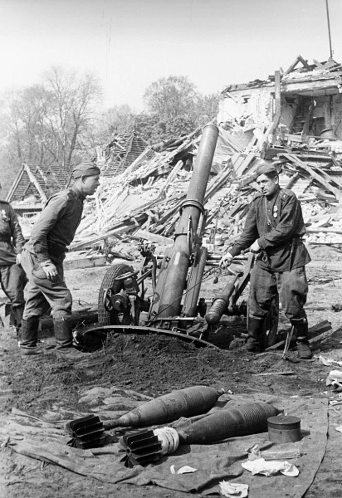 Миномёт МТ-13 в уличном бою. На переднем плане боеприпасы, хорошо видна гильза
