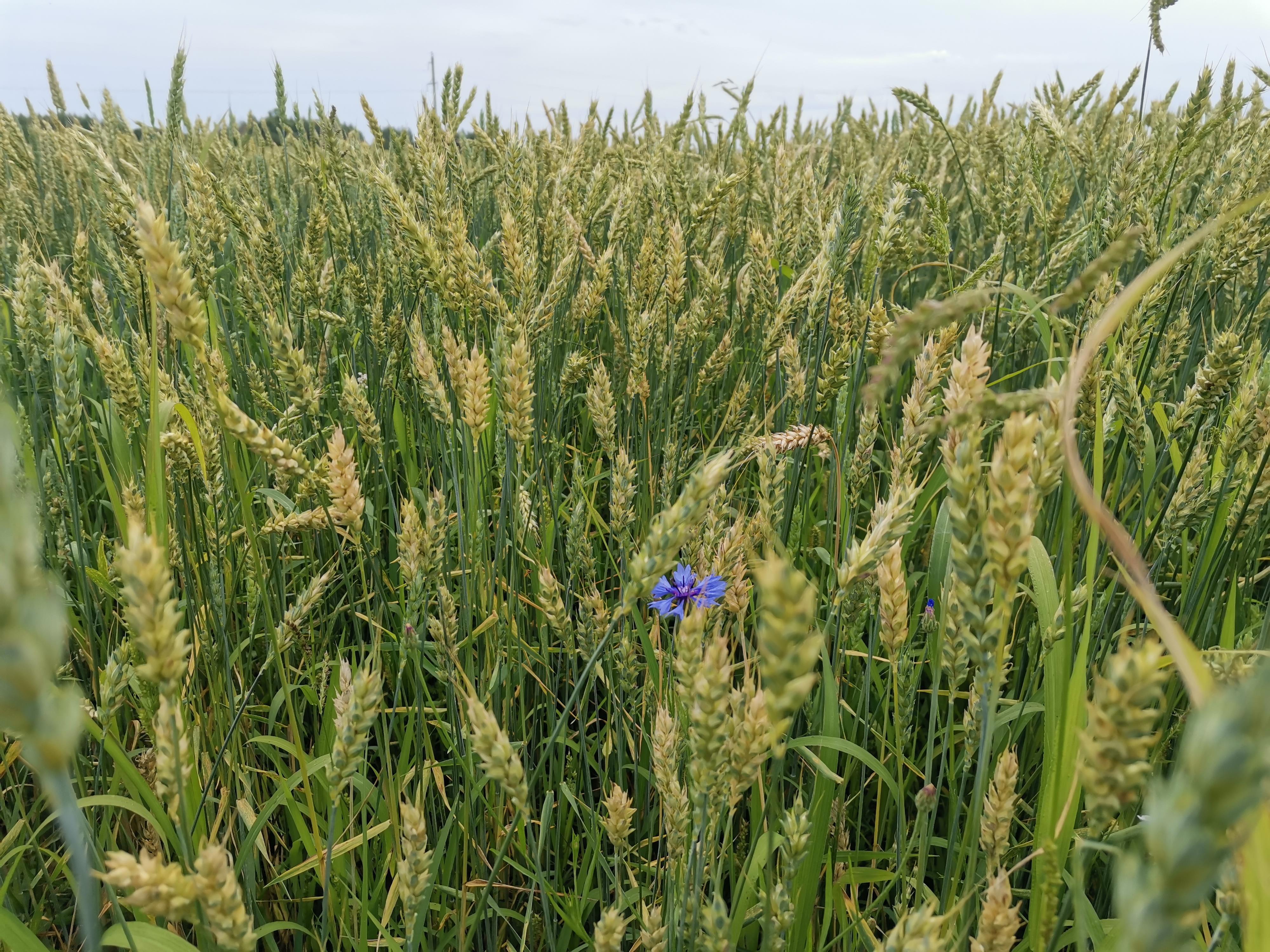 Я не очень разбираюсь в злаках, но вроде это пшеница. Точно не рожь, рожь другая. А вот тётя говорит, что это ячмень. Думаю, она права. А на третьей фотке василек ещё. Красивый.