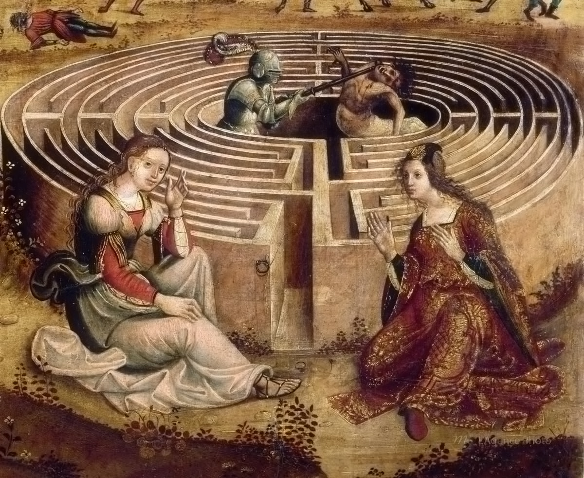 Откуда создатели взяли символ лабиринта? Из мифа о Тесее и Минотавре. Позже поэты и художники придали этому мифу сакральный смысл. Тесей сражается с Минотавром в центре лабиринта, что символизируется победу над животным началом.