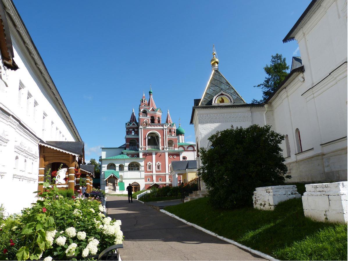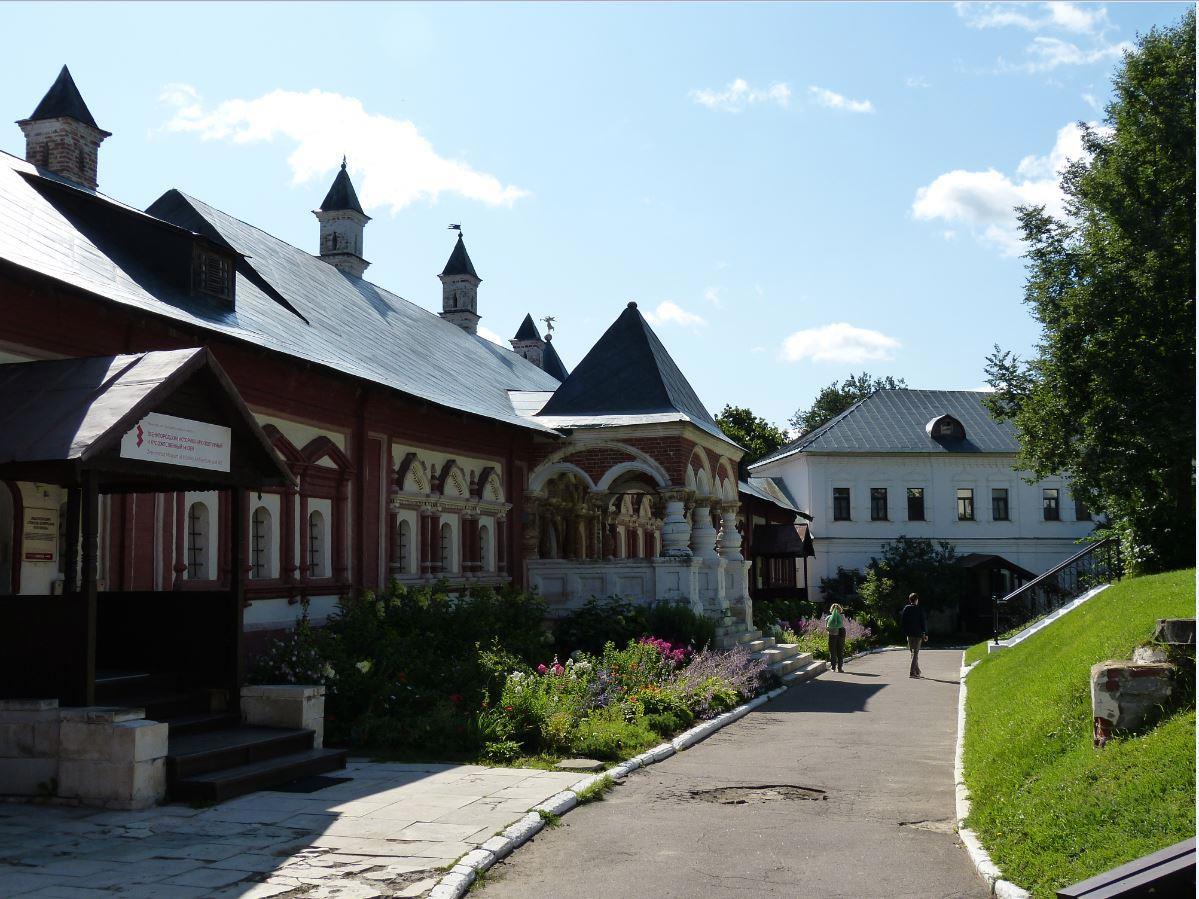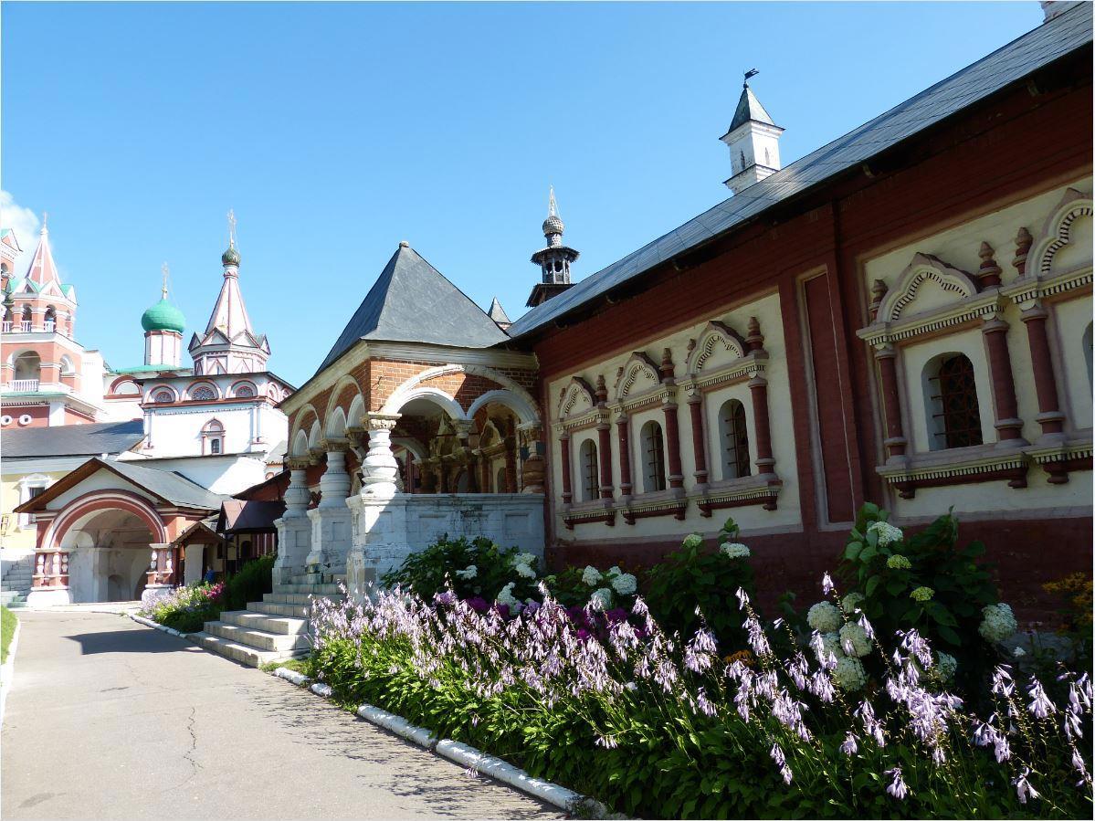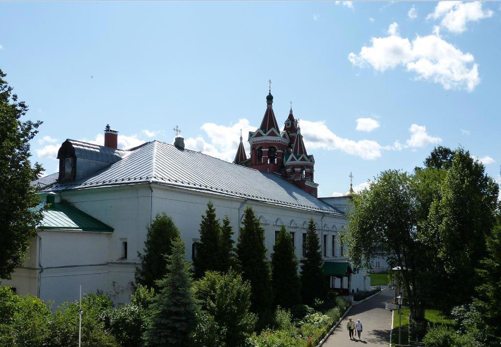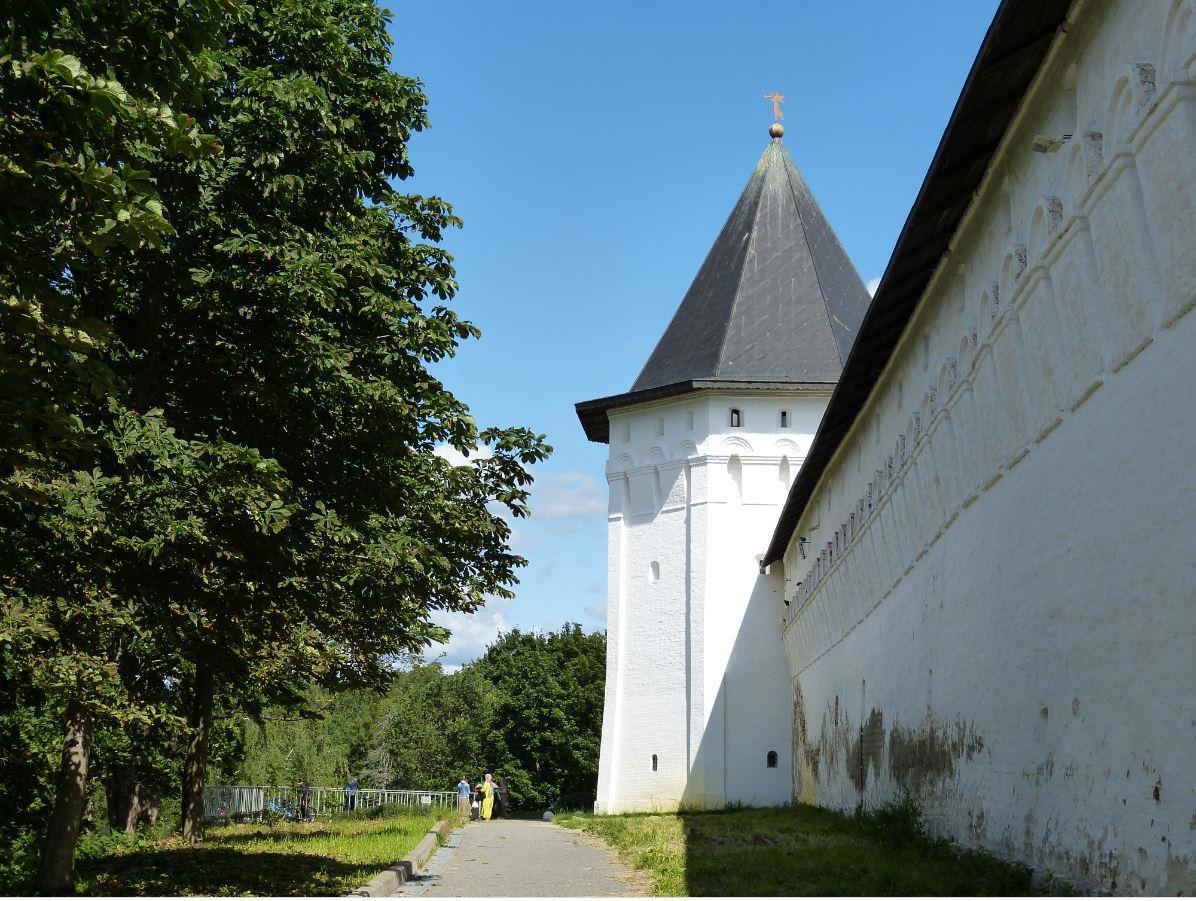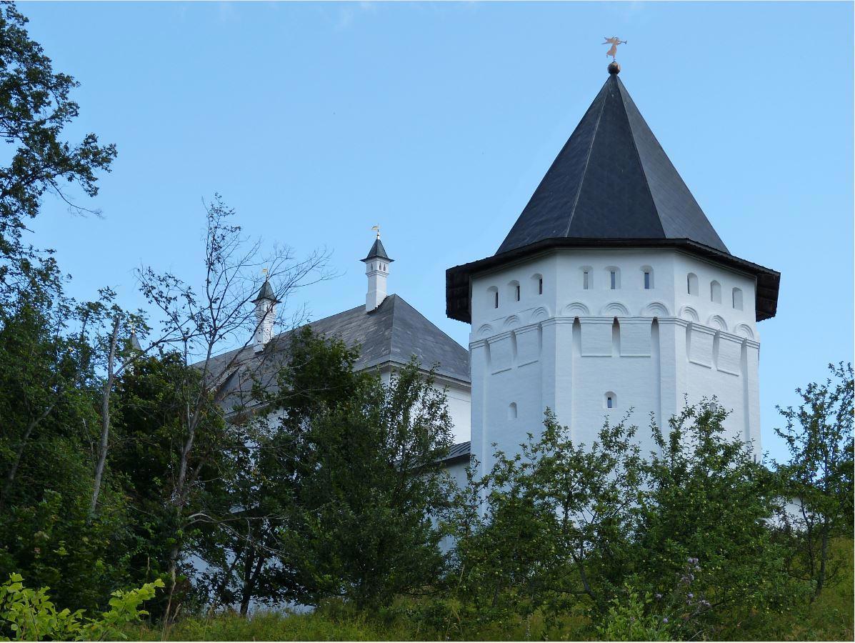 Сам монастырь прячется за разросшимися деревьями. Вот так, к примеру, выглядят снаружи Житная башня и палаты Алексея Михайловича.