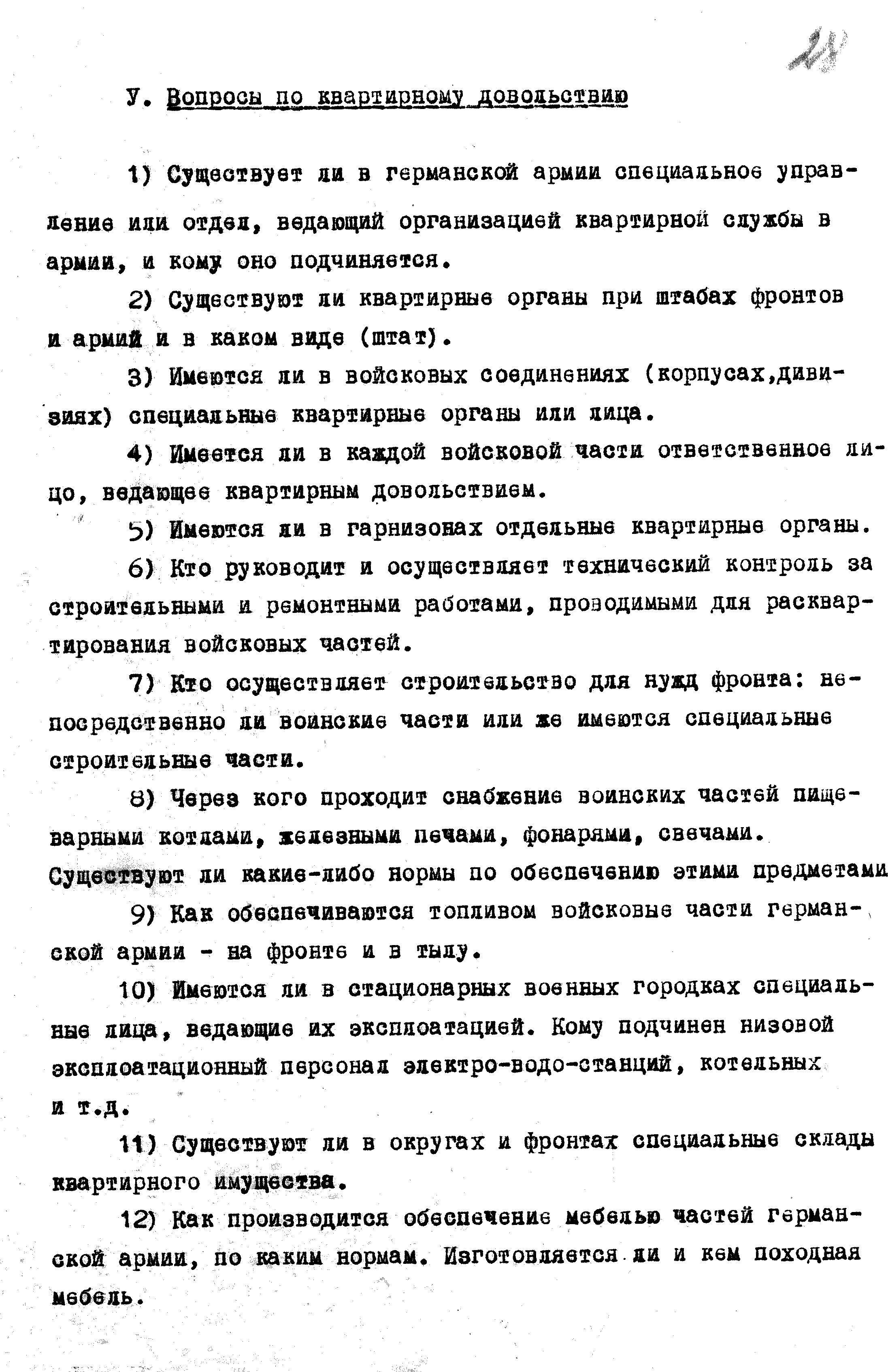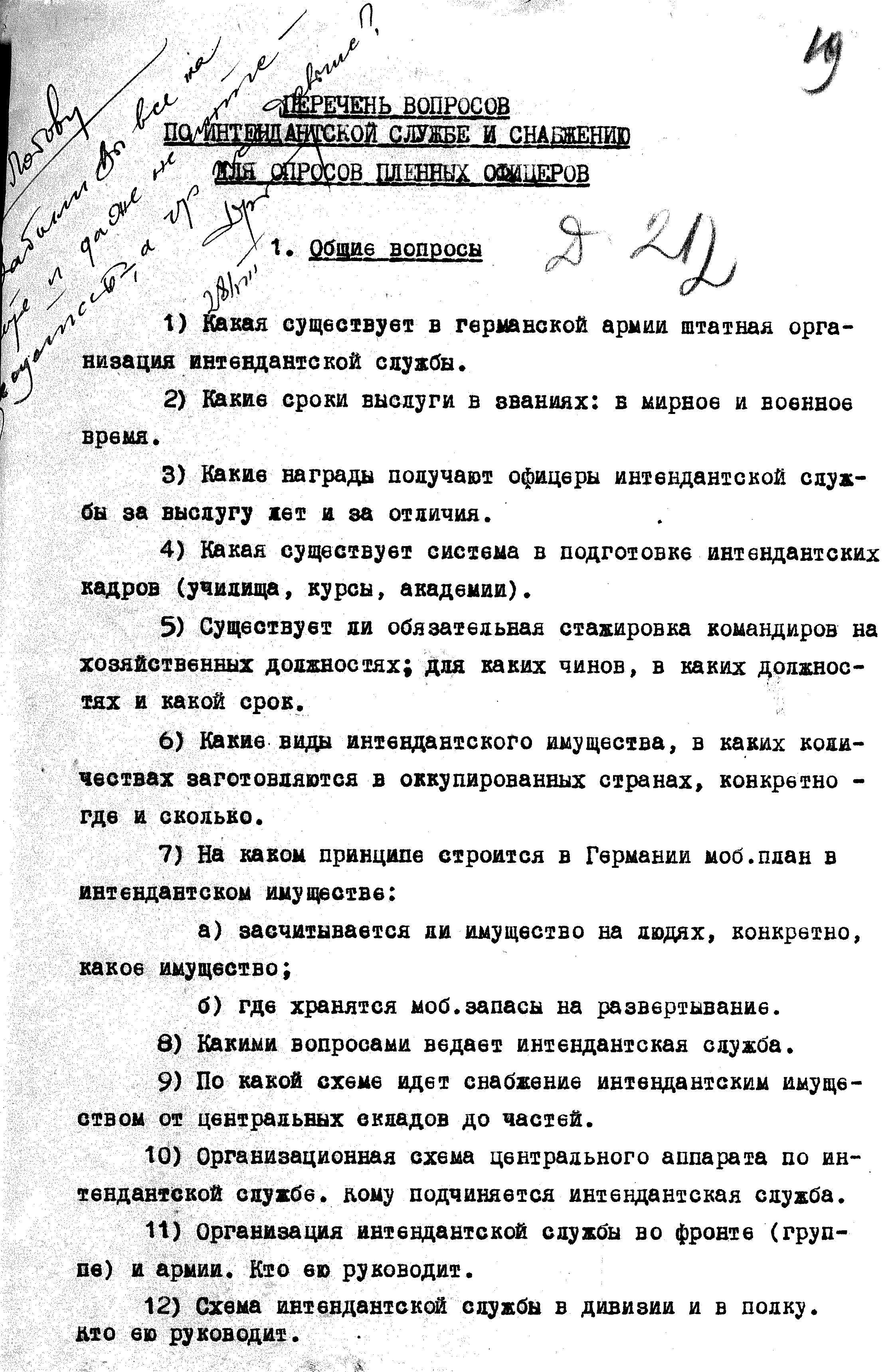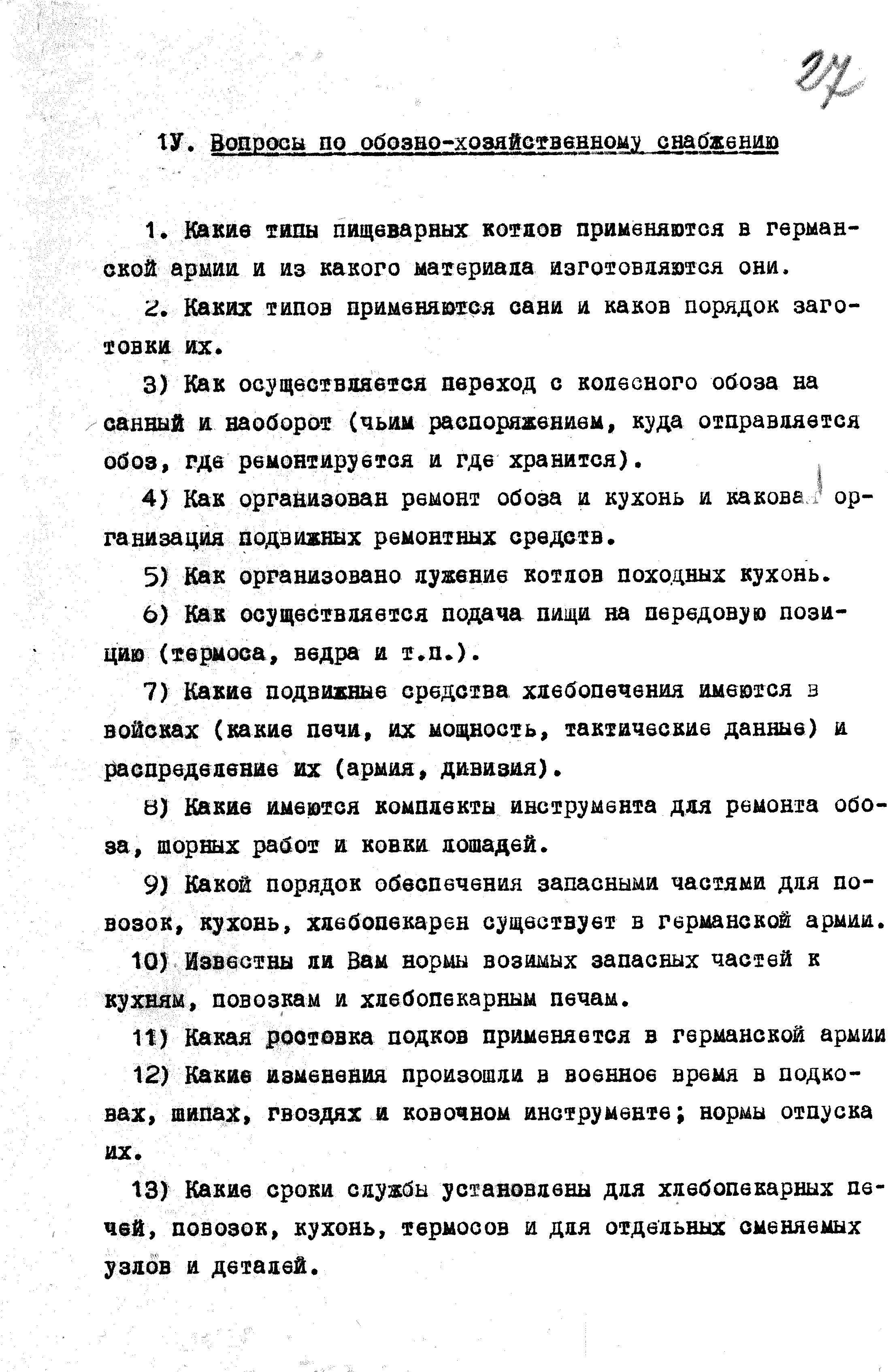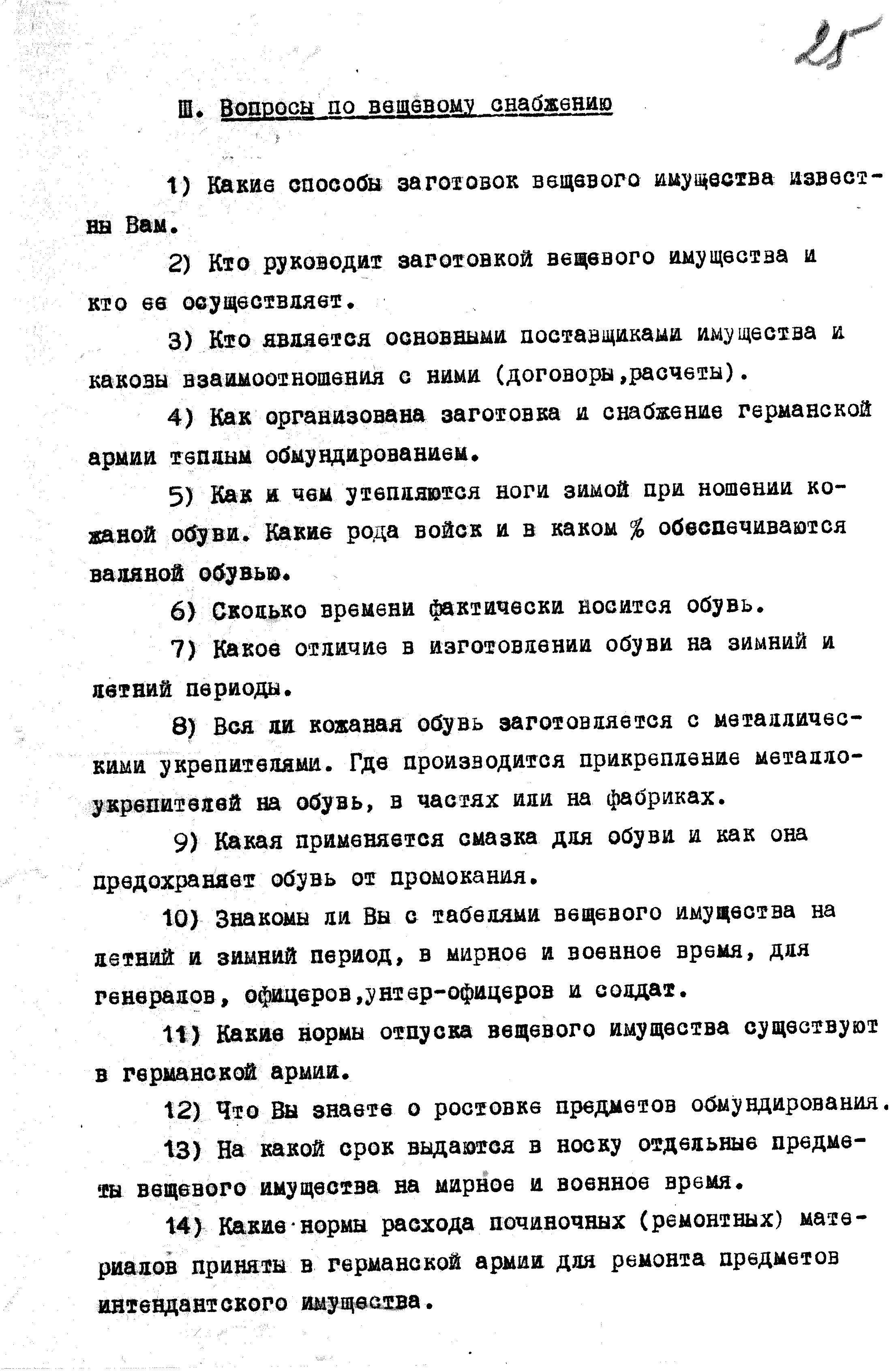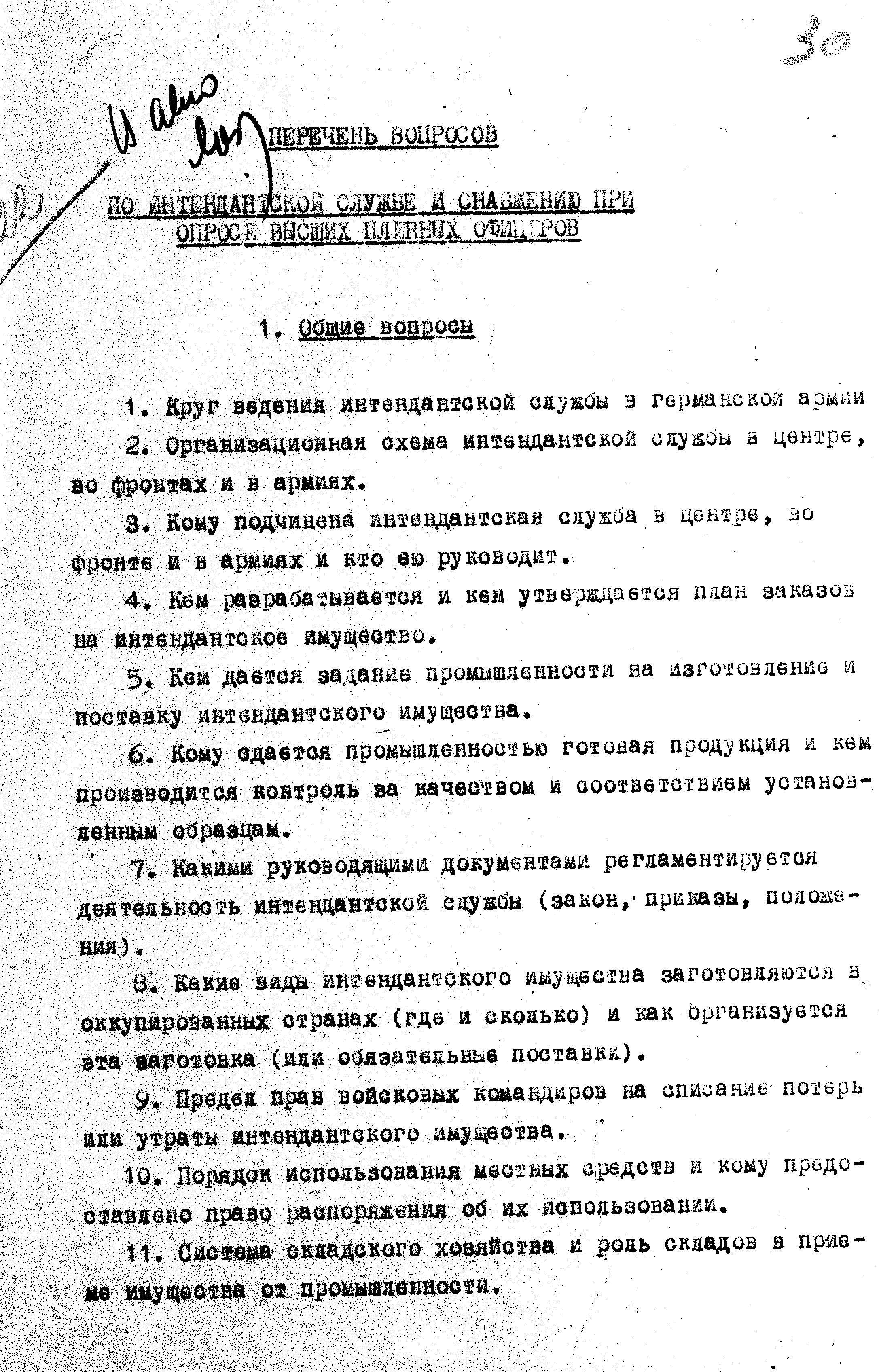 Перечень вопросов по интендантской службе для опросов пленных гитлеровцев